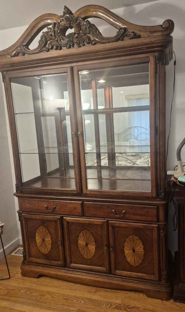 Sturdy Wooden China Cabinet Three bottom storage 2 cuttlery shelves, 4 glass shelves with reflective mirror. Bottom: Height 31", Length 54" Depth 20" Top: Height 34", Length 54" Debth, 20".