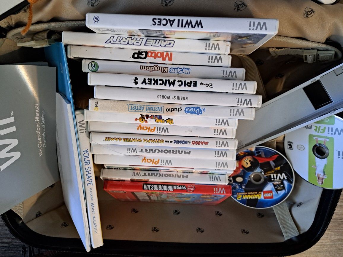 2 wii consoles 16 games with cases. 2 games without case. All the pieces to play the game, including additional ones. I am asking for $180 cash or BO and to meet up locally ONLY. Reach out if you're seriously interested. **** suitcase not included***** Ty.