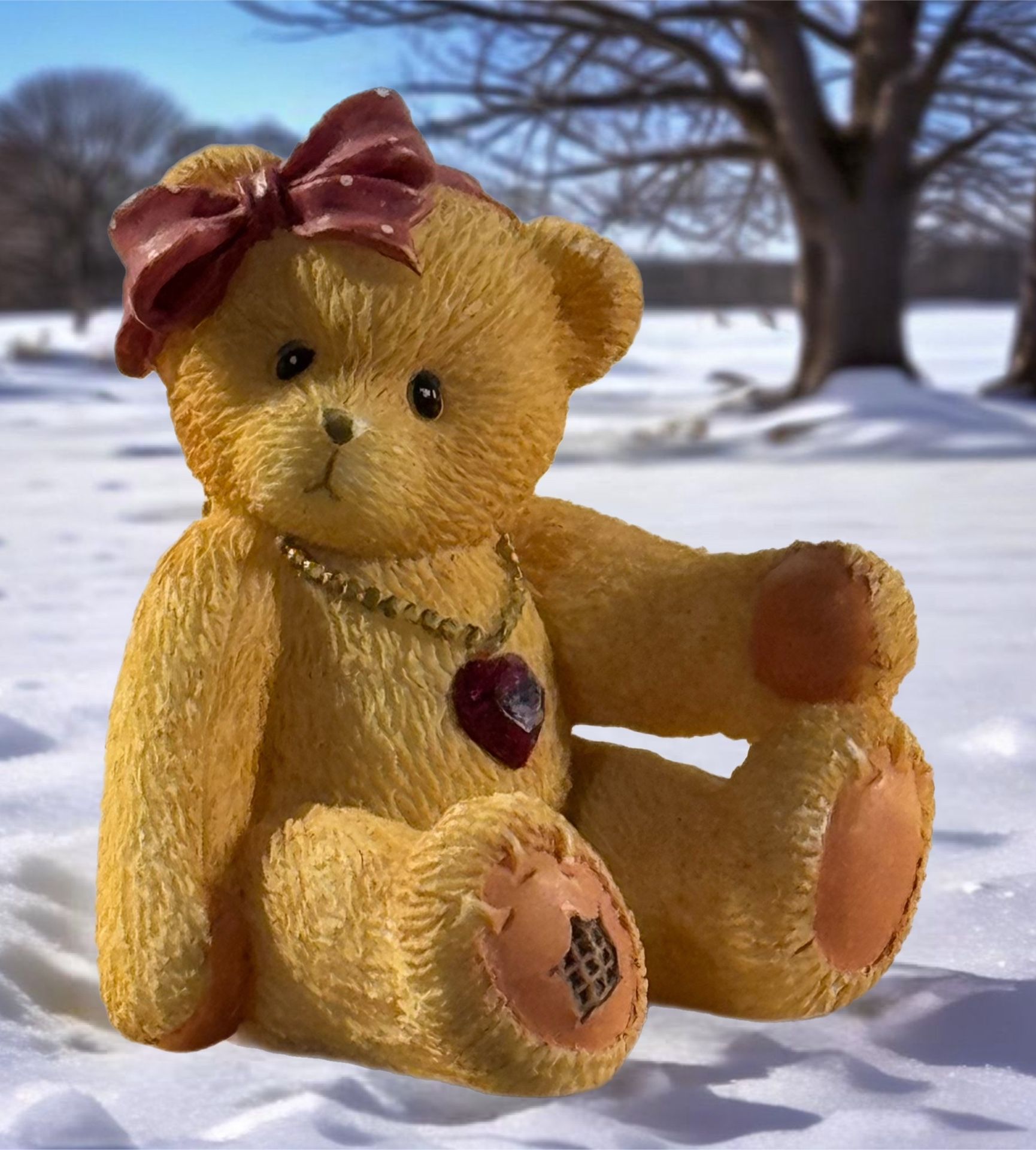 ~EUC, vintage 1996 ~adorable birthstone bear w/Austrian crystal of January garnet on necklace, marked ~designed by Patricia Hillman ~mini version of a Cherished Teddies bear ~in excellent condition: no damage or repairs ~1.75”L x 1.25”W x 1.5”H ~smoke free/dog friendly home ~POOS FCFS ~$12 or best offer