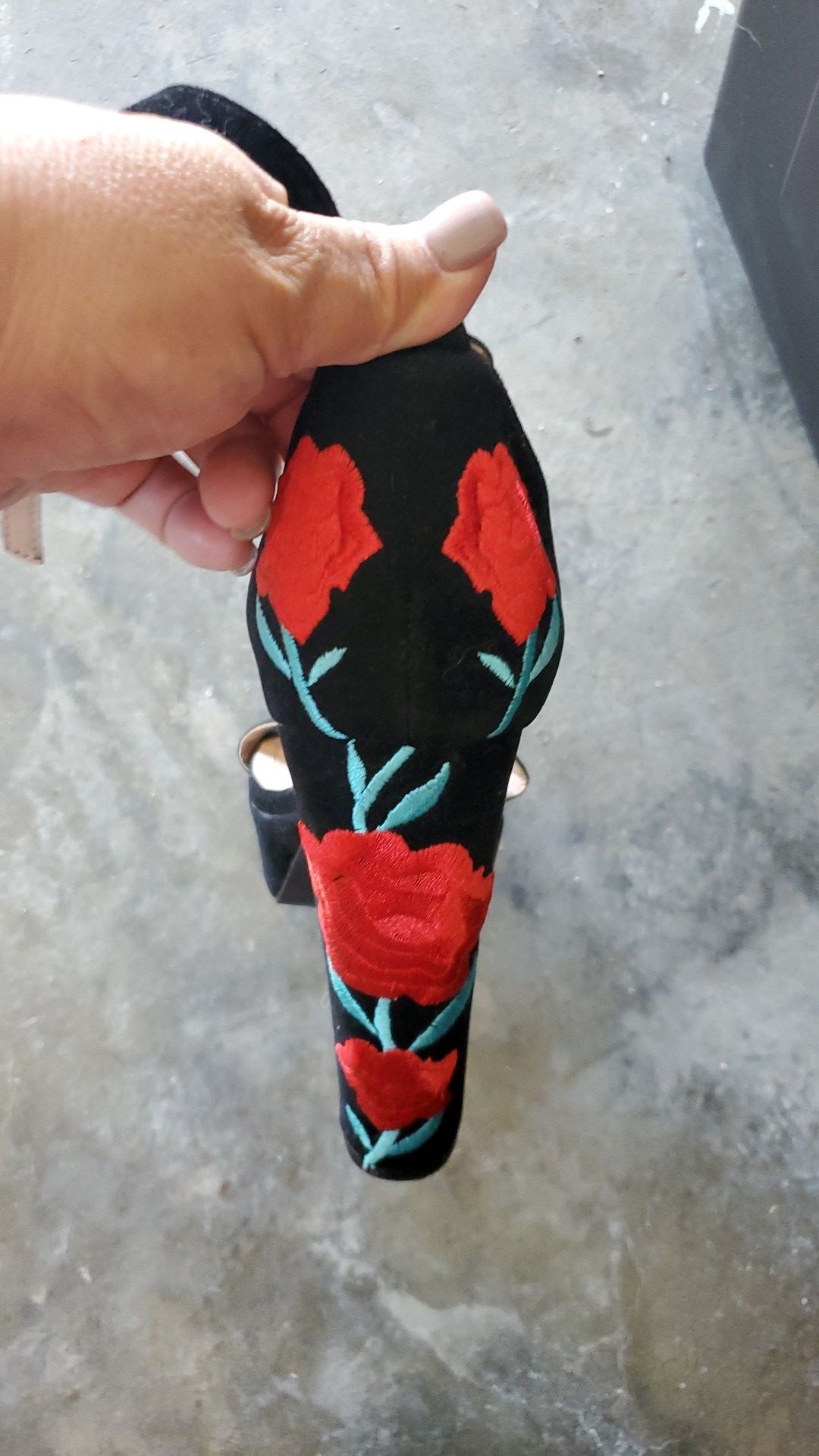 Black with red roses on back part very pretty platform front velvet material size 81/2
