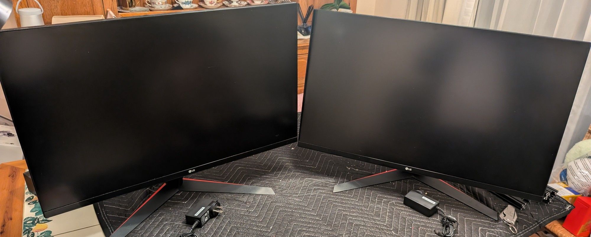 Two monitors 32 inch used, includes original power supply. Model number 32GK650F-B Great for gaming , 165 hz refresh rate. G-sync compatible. Two HDMI ports and one Display port. Would prefer to sell as a pair $150 each, $290 for both Will consider reasonable offers