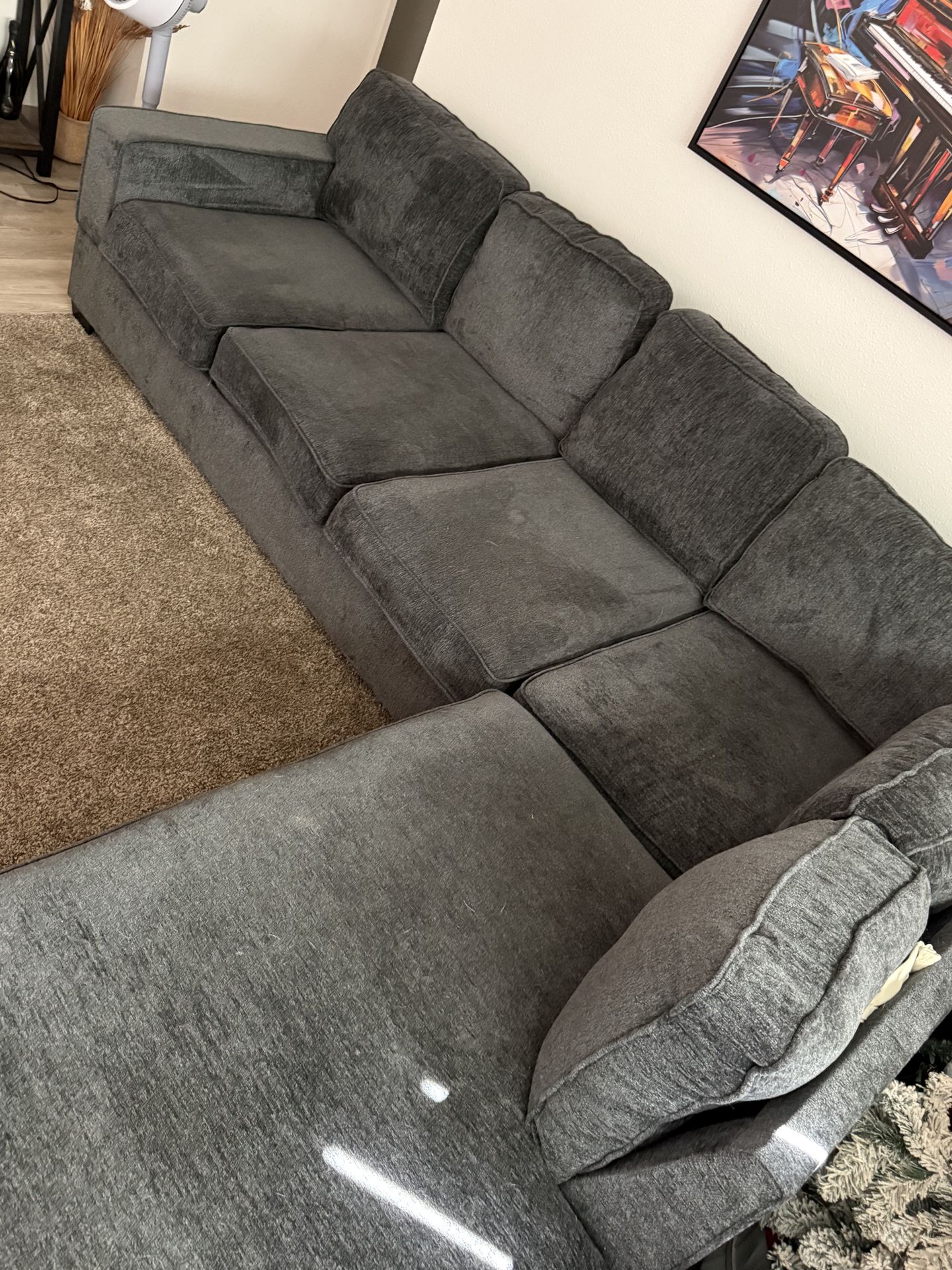 Selling a stylish and comfortable gray sectional sofa with chaise. Perfect for a living room, apartment, or family space! ✨ Details: • Neutral gray color (matches any décor) • Reversible-style chaise for lounging • Deep, plush cushions for comfort • Modern, clean-lined design • Seats 4–5 people comfortably 🧼 Condition: • Gently used • Minor wear consistent with normal use (see photos) • No major stains or damage 📏 Approximate Size: • Great size for medium to large living spaces 🏡 Perfect for: • Apartments, homes, or staging • Movie nights, entertaining guests, or relaxing 📍 Pickup: National City 91950 No Delivery Message me if you’re interested or have questions!