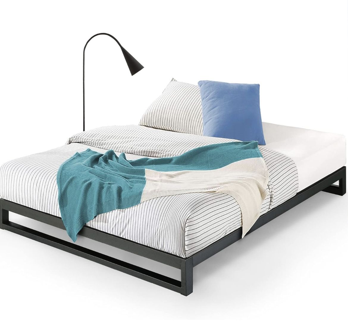 Black bed frame. King size. Low profile. Very sturdy. Doesn’t creak when you move around. Only used for a few months.