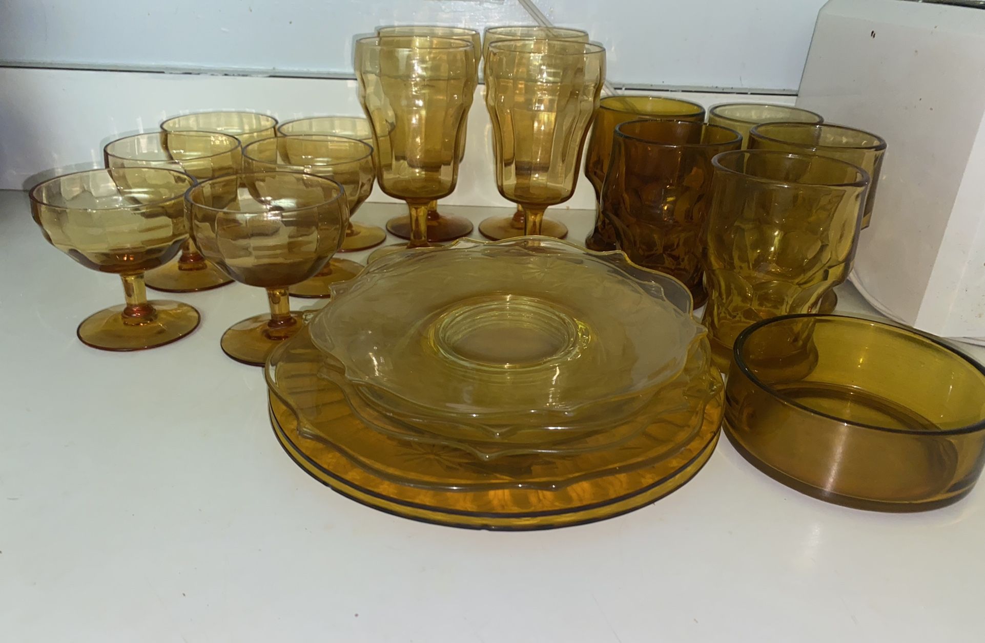 Mint condition. Yellow transparent glass. 6) Bourbon Glasses 4) Desert Glasses 5) Drinking Glasses 1) Ashtray 6) Plates 1) Small decorative Dish