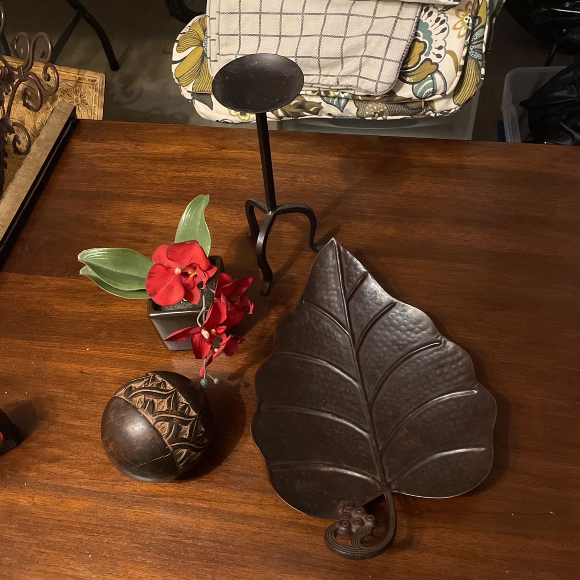 $2 Candlee holder (12” tall) $5 Leaf 16”x10.5 (can be placed in table or hung) $3 Wood ball 4.5 $3 Flower decor 8” tall