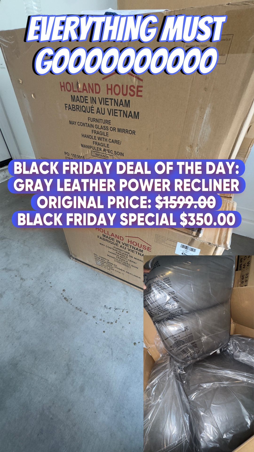 Brand New still in the plastic Leather Recliner Chair. We only have 2 left get them while they last Original price $1599