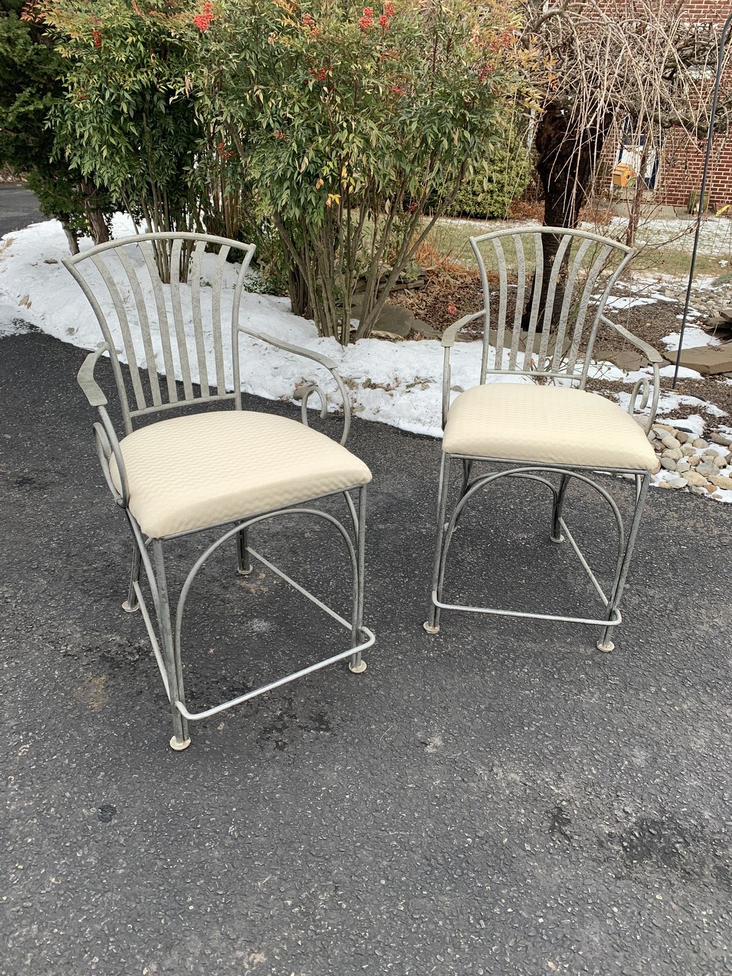 These stools are metal and a little on the heavier side, so very sturdy. Recently recovered with new fabric over the foam seats. There are some scratch marks as you’ll see in the photos. Measurements and photos as well.