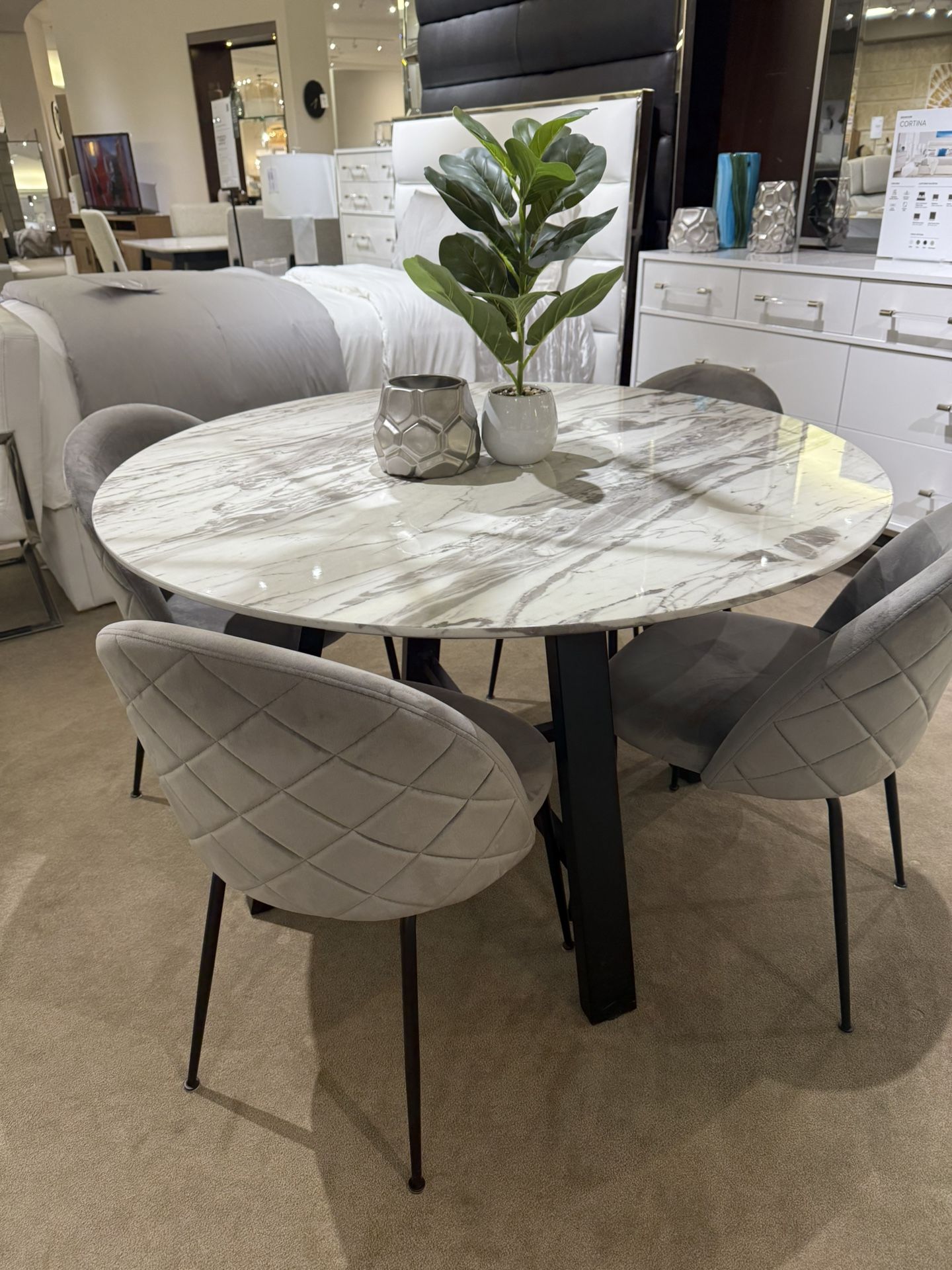 Round Table and 4 chairs Floor Sample – Clearance – As Is This item is a showroom floor sample and is being sold at clearance pricing. Sold as is. Minor defects or signs of use may be present. Item must be picked up and delivered by a licensed and insured moving company (no customer pick-ups). We’re happy to provide a list of trusted local movers to make it easy.