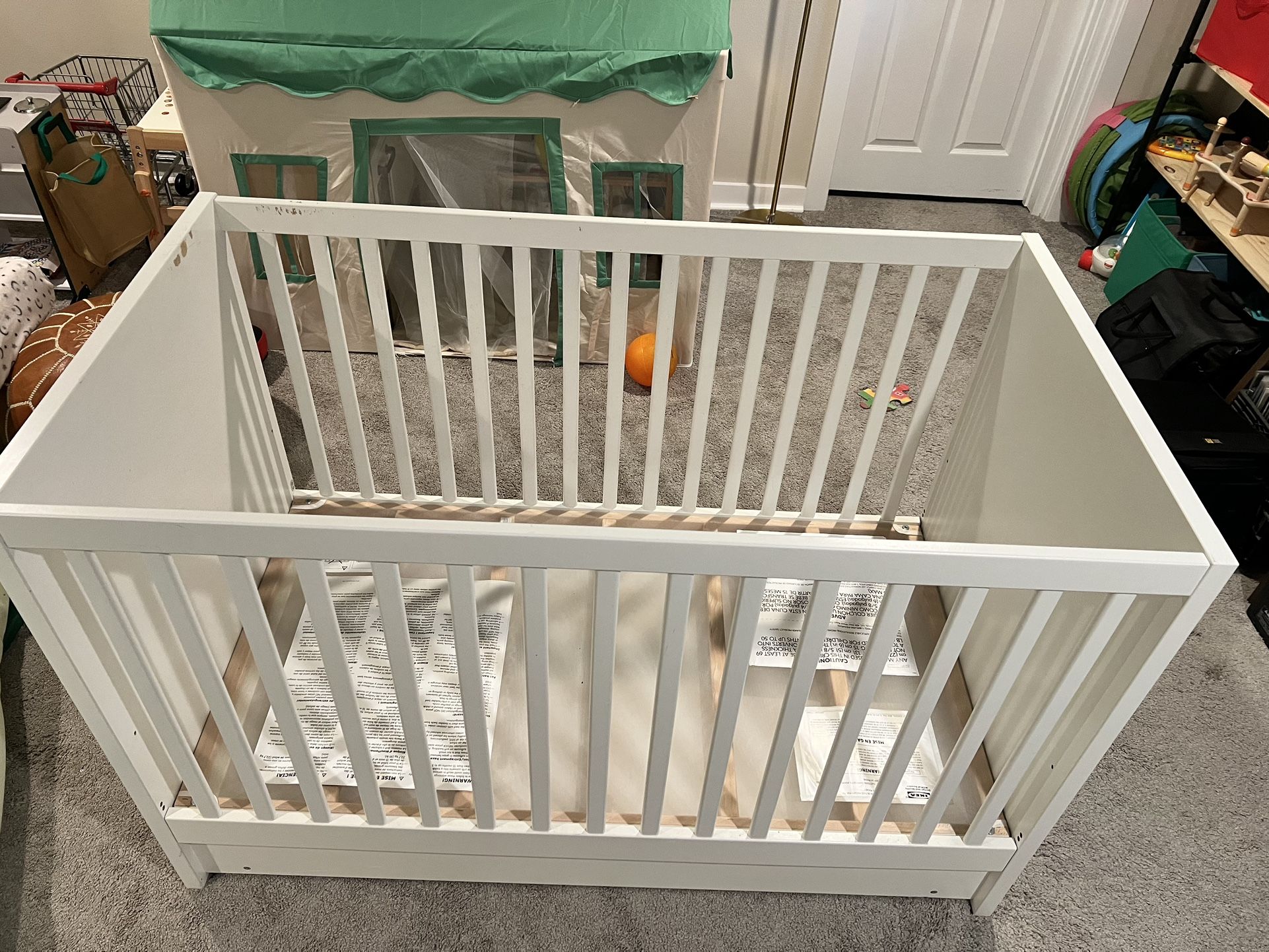 The IKEA STUVA crib with drawers is a, now discontinued, versatile, modern baby bed featuring two built-in storage drawers beneath the mattress, commonly found on the secondary market. It includes a conversion kit to transform into a toddler bed, two adjustable mattress heights, and complies with safety standards. PICK UP ONLY - SE PDX