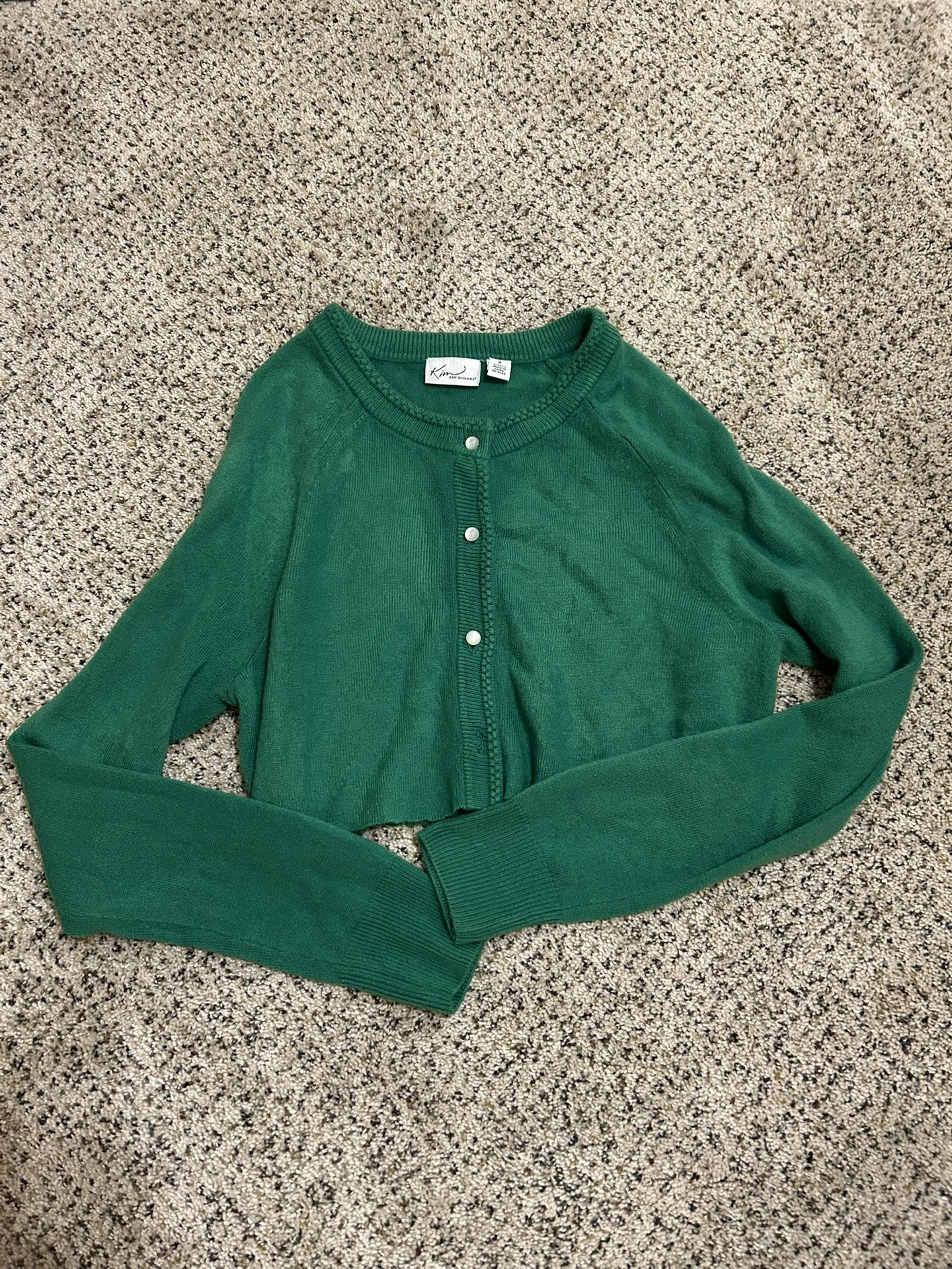 Embrace elegance with this Kim Rogers cardigan, crafted in a vibrant green hue. The fine-knit material offers a soft texture, making it perfect for layering or wearing alone. Its cropped design and long sleeves add a touch of modern sophistication to any outfit.