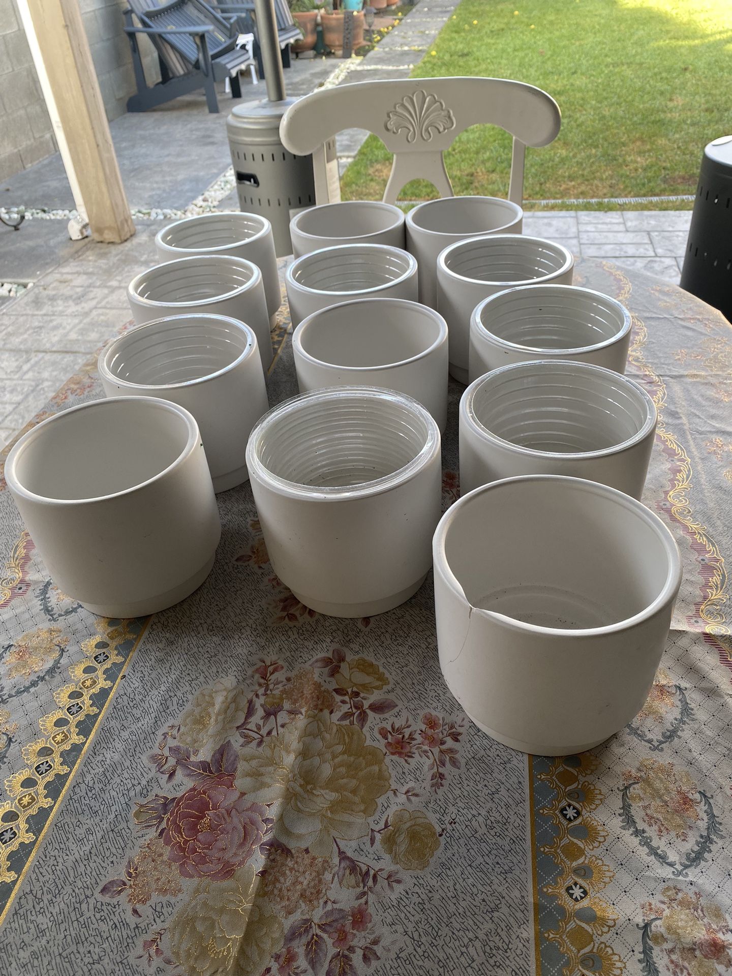 13 total purchased at Joann’s for $14.99 per vase One is chipped but can be easily hidden with flowers Waterproof tape to cover hole to prevent water leakage but can be removed