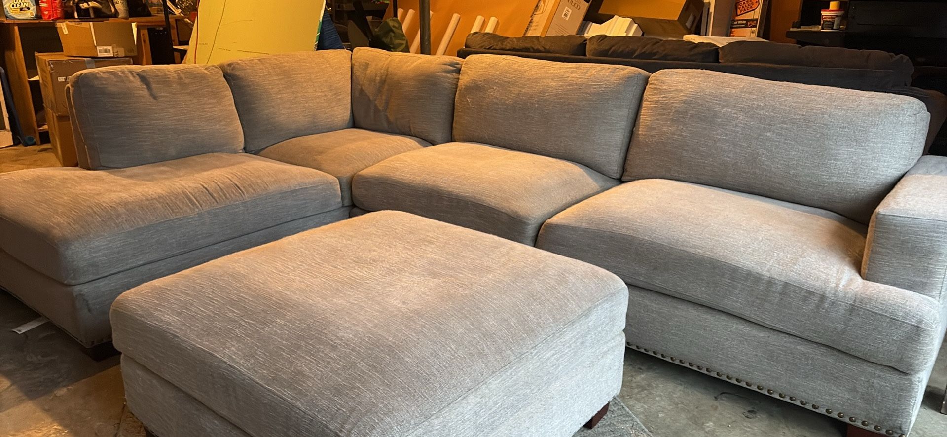 Beautiful modern light gray sectional sofa with a large matching ottoman. Super comfy with deep seats, supportive back cushions, and a clean neutral color that fits any space. Great for movie nights, hosting, or just stretching out. ✅ Clean and well kept ✅ No rips or tears ✅ Deep seating / very comfortable ✅ Oversized ottoman included (can be used as a chaise or coffee table) ✅ Solid frame + modern nailhead detail (as shown) Delivery available (message your zip code for a quote). Pickup also welcome. If you’re interested, send your zip code + pickup/delivery preference and I’ll get you scheduled.
