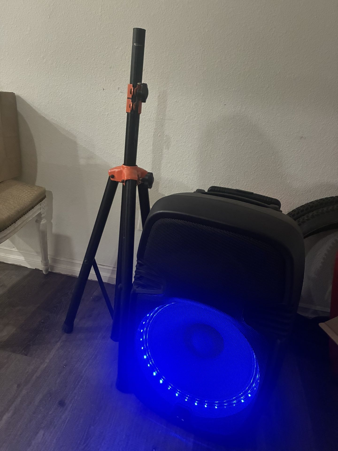 Audio Power: Crystal clear sound with adjustable Bass + Volume. • Versatile Inputs: Supports Mic, Headphones, DJ Sets, and Bluetooth. • Visuals: Dynamic color-changing light display. • Extra Value: Includes an adjustable security stand (perfect for crowds or events). • History: 3 years old, light use, works like new. Open to negotiations. serious inquiries only!