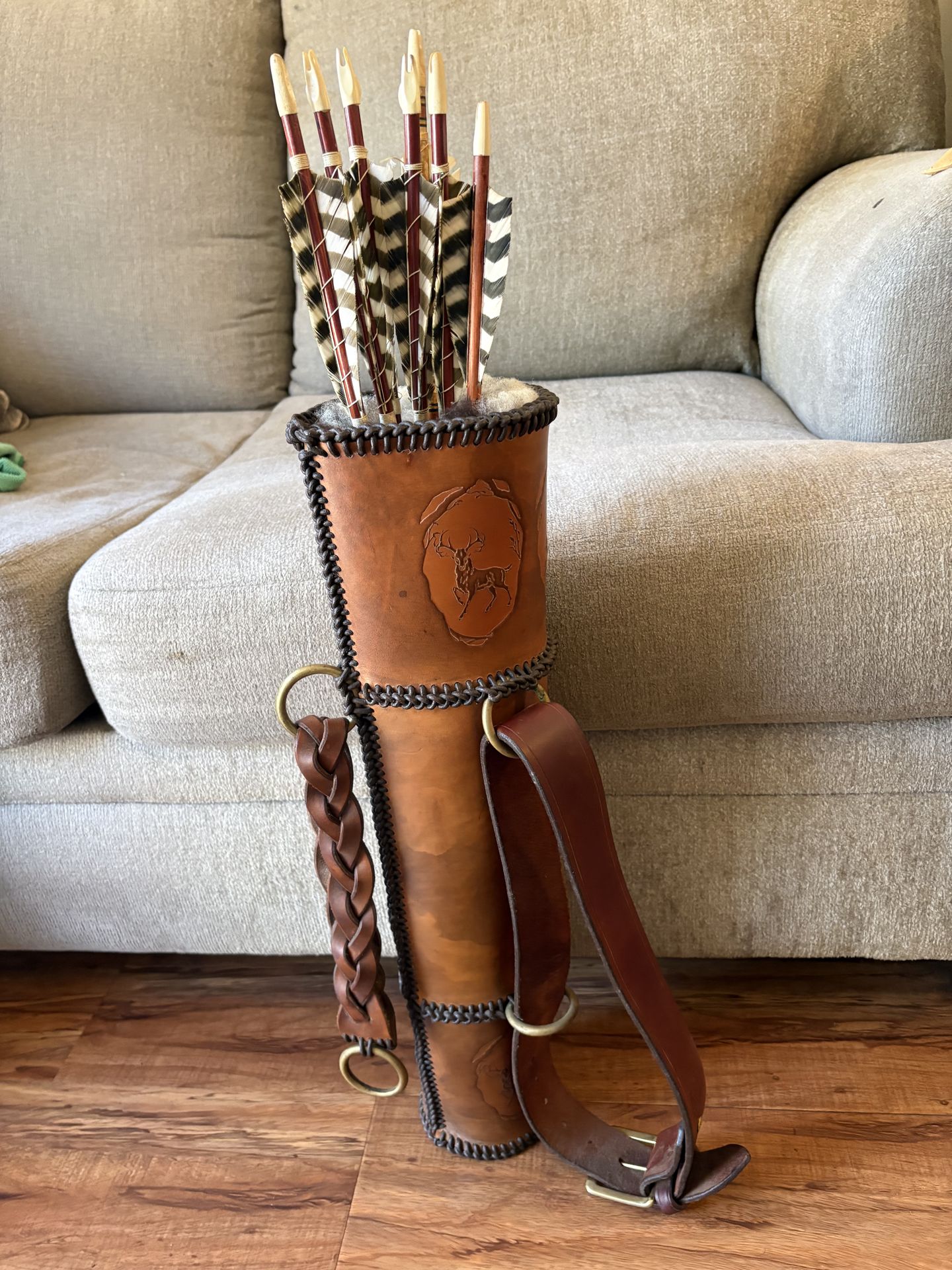 Beautiful Leather Quiver with strap by Rob Leahy Handcrafted leather quiver with details of deer and wolves. Arrows are not included. Pick up only please.