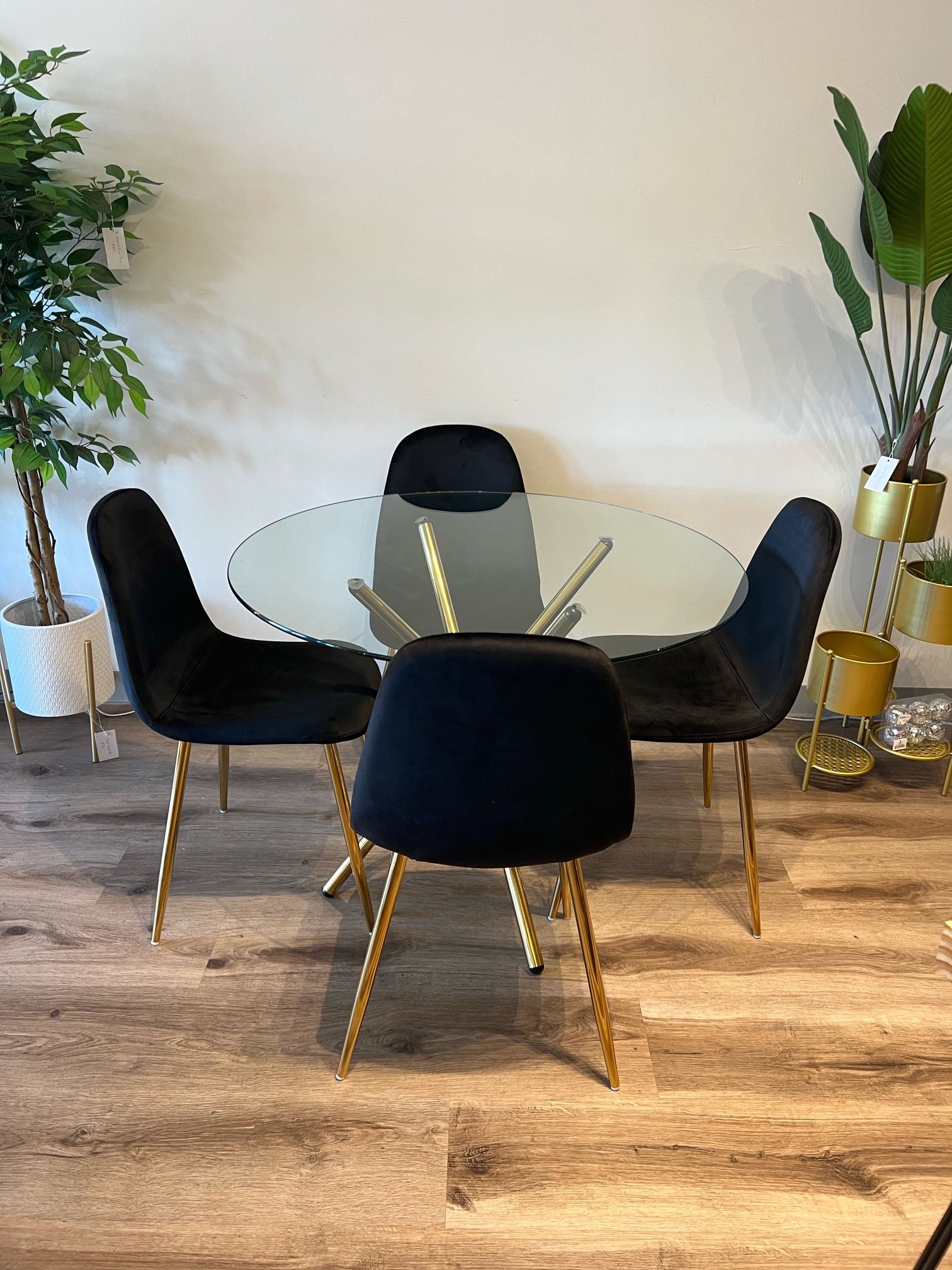 This is a brand new set - High quality, modern round dining table set - Glass circle table top, gold chrome legs - 4 comfortable velvet chairs included - Velvet top, gold chrome legs 7 color options available for chairs Table Dimensions: 47” Diameter 29.5” Height Either you pick it up or I can deliver for an extra fee