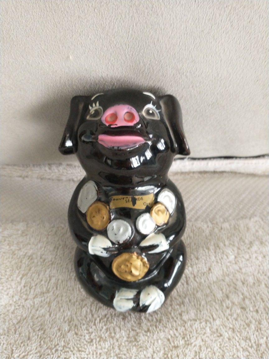 Vintage ceramic Piggy Bank from around the mid 1950s. In great shape. No scratches or chips. Just missing the coin stopper on the bottom.