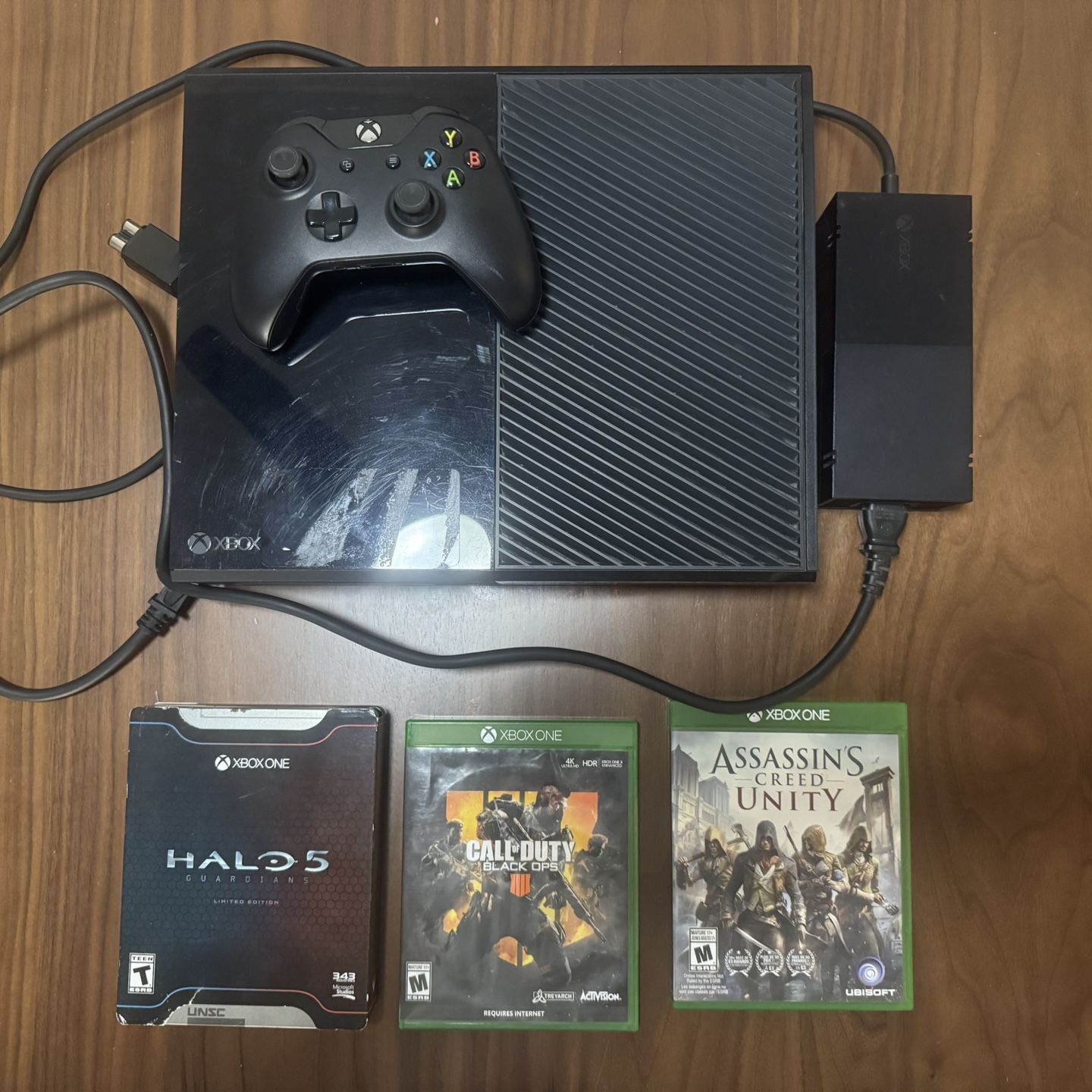 Xbox One 500 GB Comes with one remote, three games and power codes. Everything tested and working. Assassin’s Creed: Unity Halo 5 Call of Duty Black Ops 4. Console has sticker residue as seen on picture. Small corrosion residue on remote but works fine.
