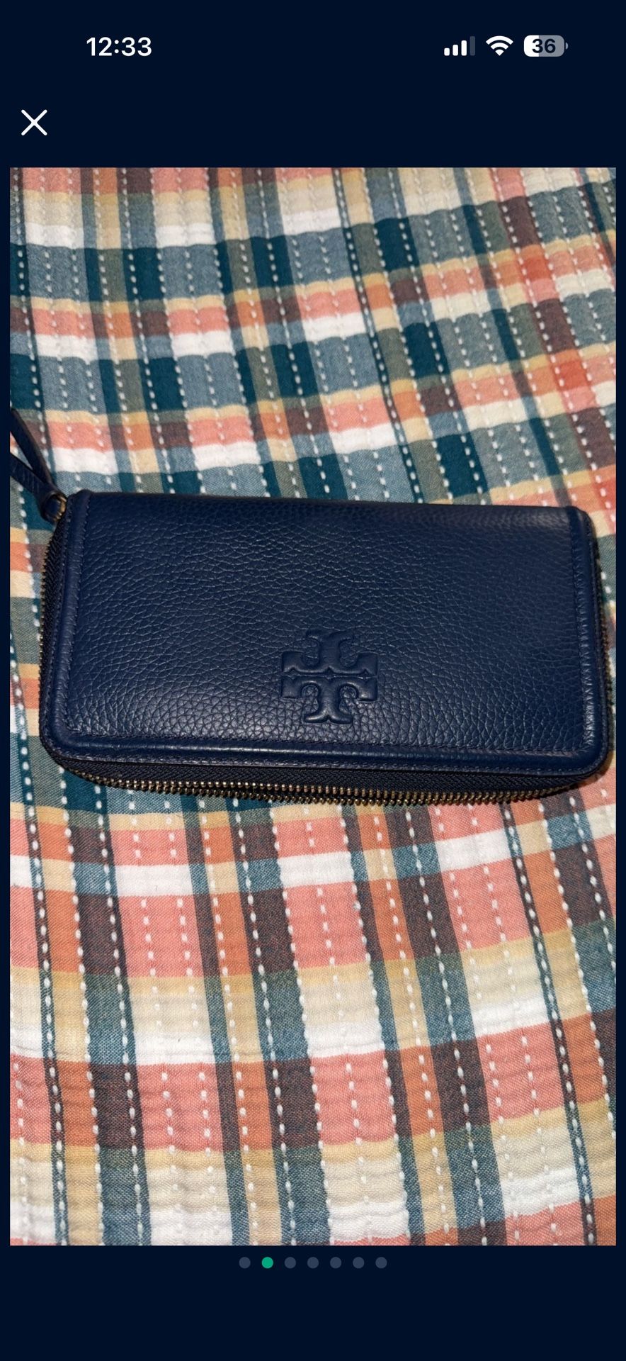 a navy blue Tory Burch Thea Zip Continental Wallet. It is made of pebbled leather with a zip-around closur excellent condition if interested I’m located in San Bernardino