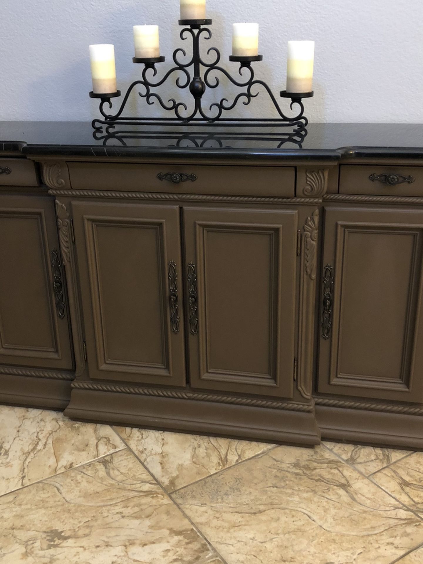 Dining buffet painted in chocolate brown chalk paint with original black marble top Black top has round stain ,& cracked on the front corner , see picture Dimensions 81x36 MUST PICK UP IN EASTVALE.