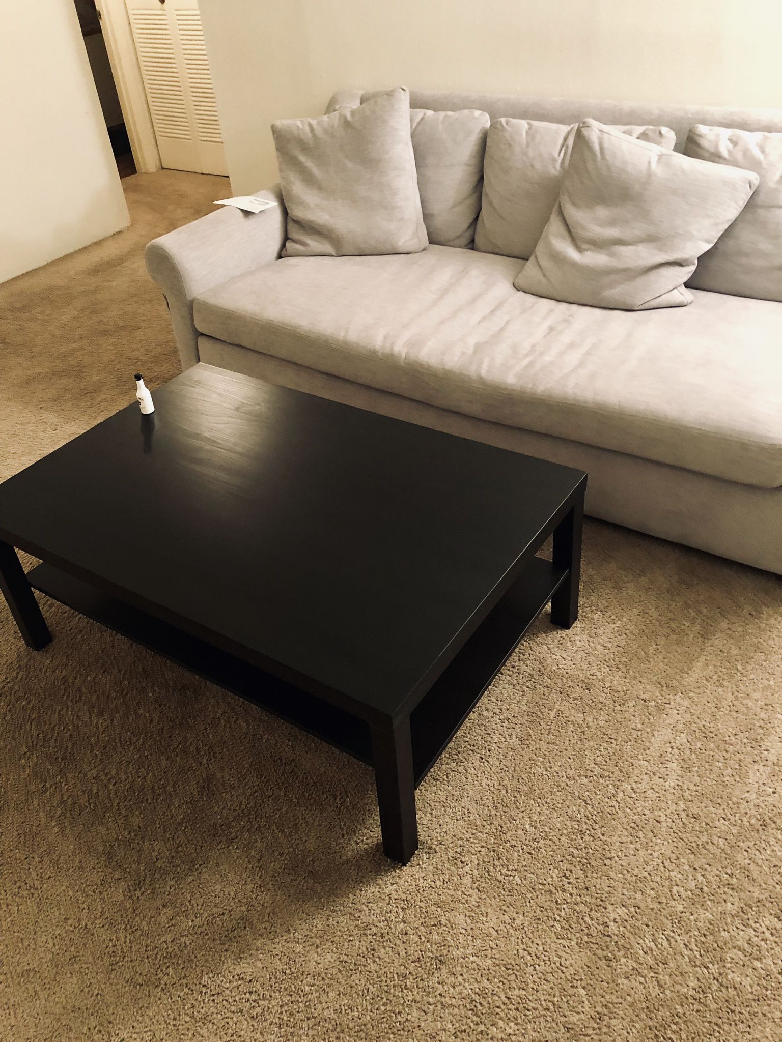 Couch sits deep and color is Ash Grey and Black coffee table, I’m willing to sell separate but together I’m asking 400.