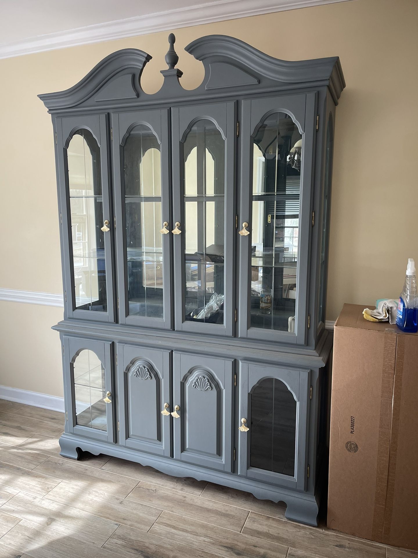 Refinished Dark Gray China Cabinet Hutch w/ Glass Doors Gold Hardware