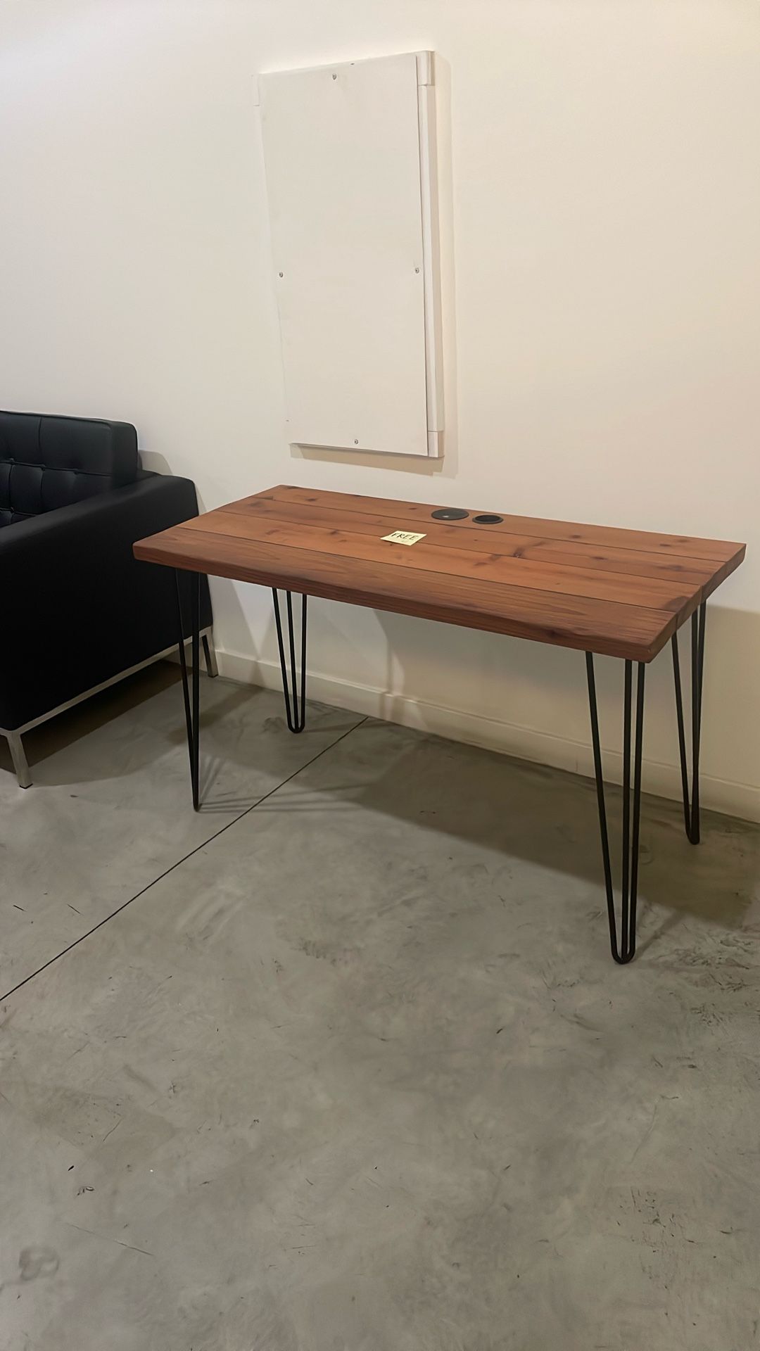 Hairpin leg desk with an outlet to plug in devices! Wooden top and metal legs. You need a cord if you do choose to use the outlet. I no longer need because I got a standing desk. Pickup only. It can fit in the back seat down of a car through the trunk. Note that I live up one flight of stairs. 48” x 22” and 29” height