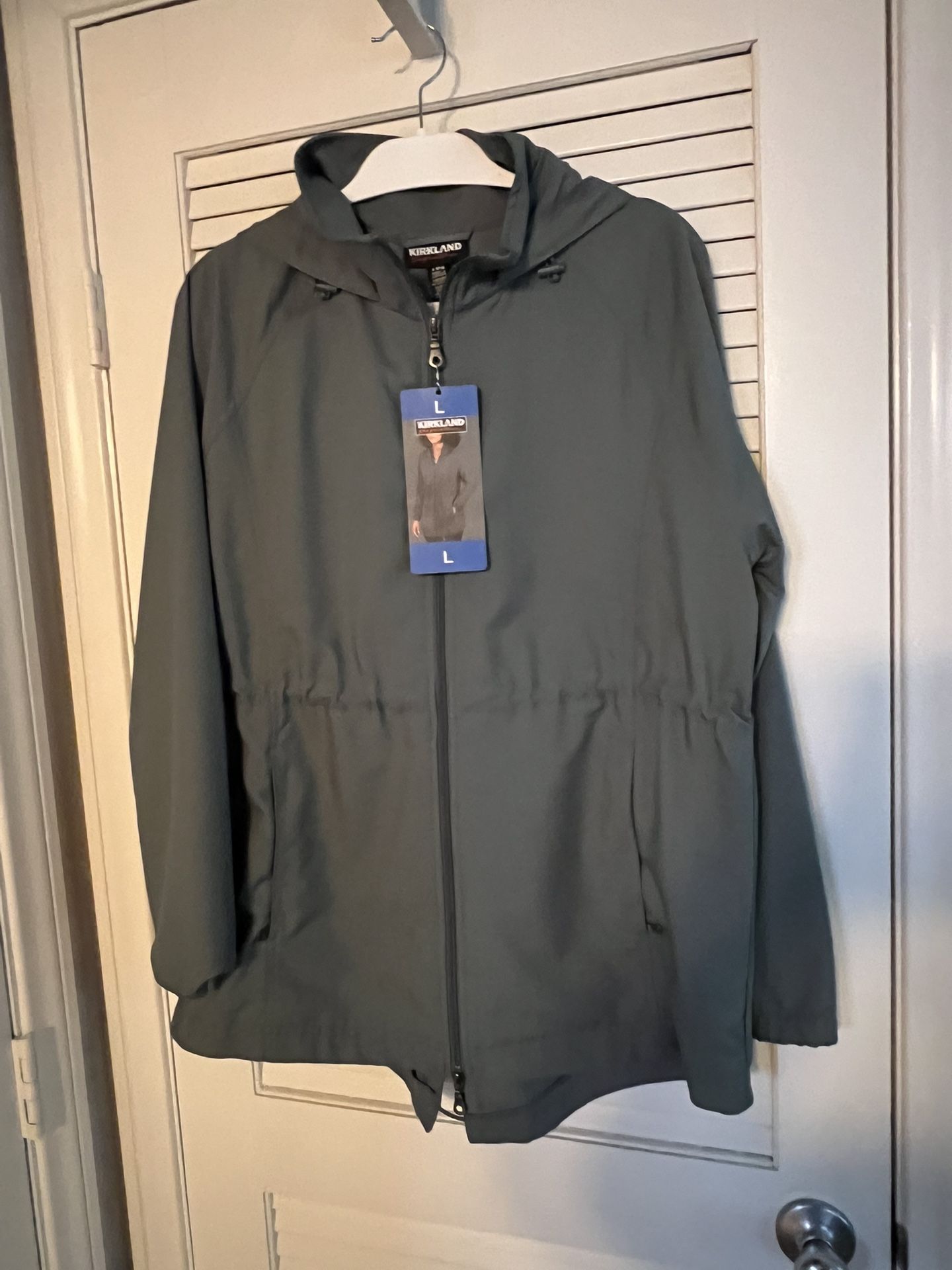 Softshell Lightweight Water-Repellent Wind- Resistant Hooded Full two way Zipper Two zipper exterior pockets Two large interior pockets Adjustable toggle waist From clean smoke free home Priced to sell Unused with tag Have second identical one but black color