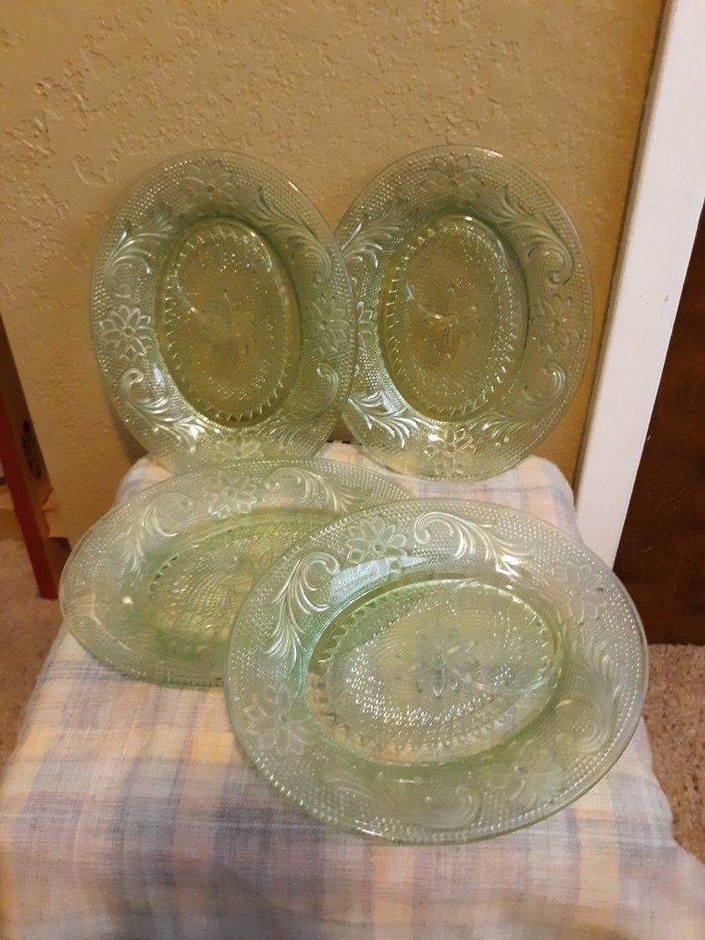 4 unique, vintage luncheon plates. Beautiful green glass with a rimmed part for a cup to sit. A few chips, but not very noticable. See pictures fir more details. Water bottle helps show approximate size.