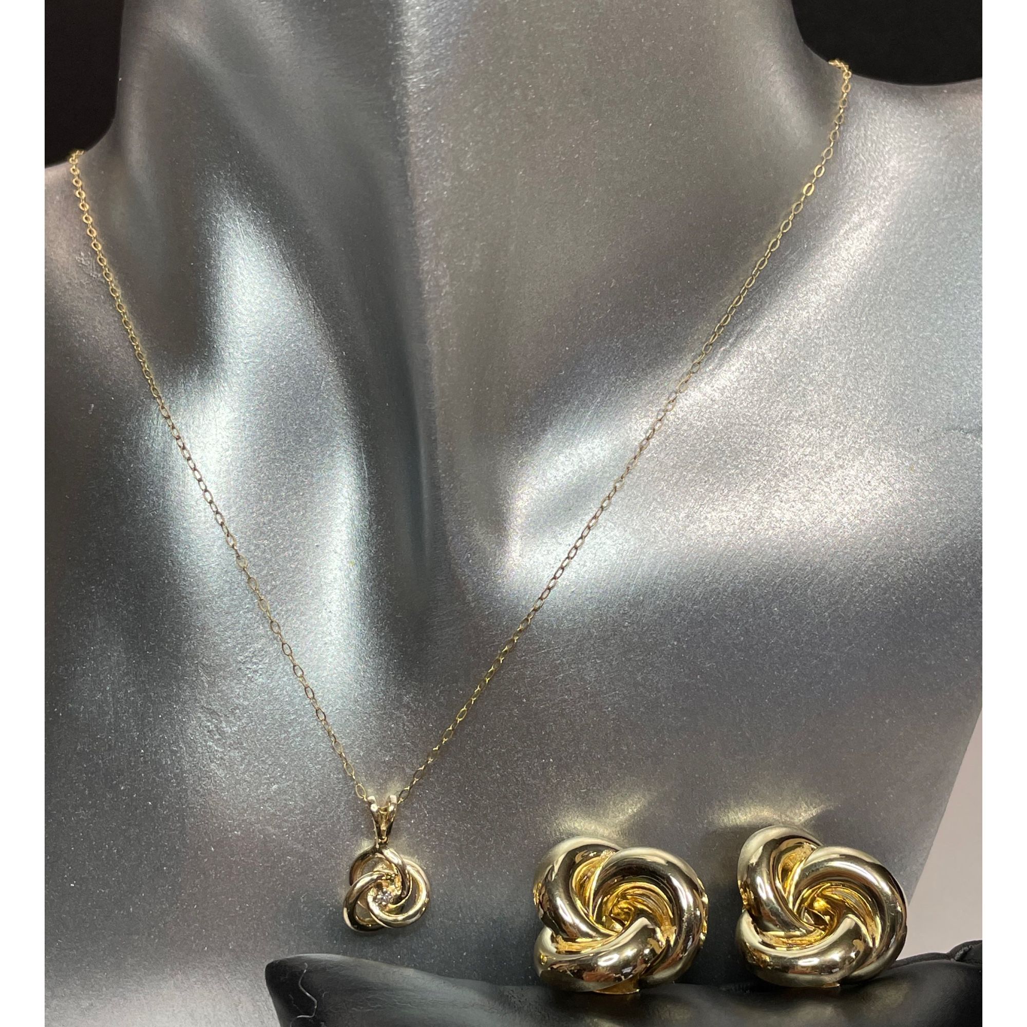 Fall in love with this set of beautiful 14KT yellow gold interlocking design earrings and Diamond pendant necklace. These gorgeous pieces are definitely a great addition to your collection and can go with any outfit. All pieces are stamped 14K & tested real 14 karat gold. Collectible fine jewelry items. In great condition. Please inspect each pic carefully for those are important part of item description. Thank you for stopping by.