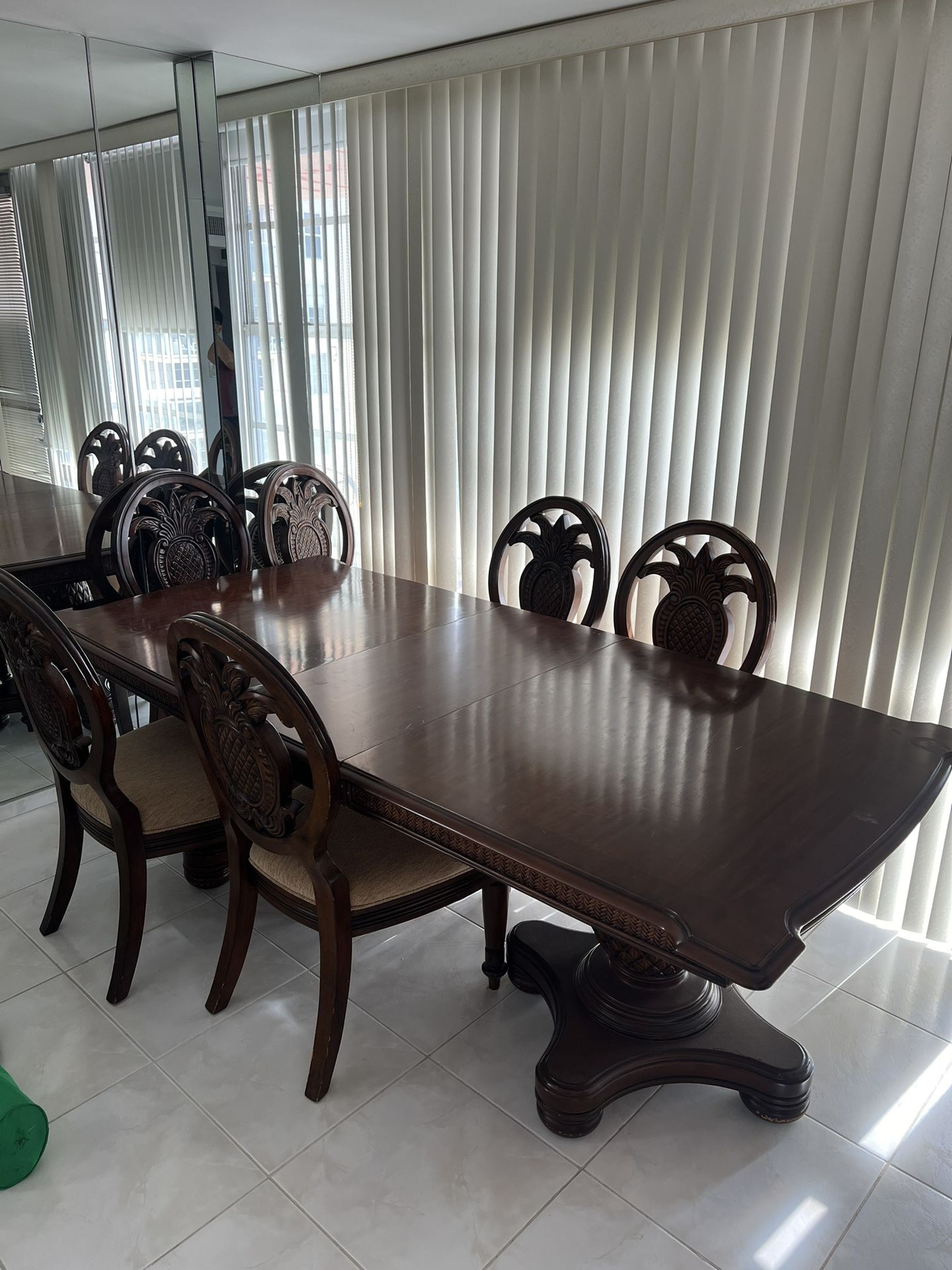 Includes: • 1 Solid Wood Double-Pedestal Dining Table • 1 Removable Leaf (extends table for larger gatherings) • 6 Matching Chairs with Upholstered Seats Details: • Rich dark wood finish with intricate pineapple carving design (a symbol of hospitality) • Sturdy pedestal base for stability • Comfortable padded fabric seats • Made in Indonesia – quality hardwood construction • Excellent condition, well cared for 📏 Size: Seats 6 comfortably, up to 8 with leaf inserted. 💲 Price: $600 OBO (similar sets retail $3,000+) 📍 Located in Sunny isles beach, FL – pickup only