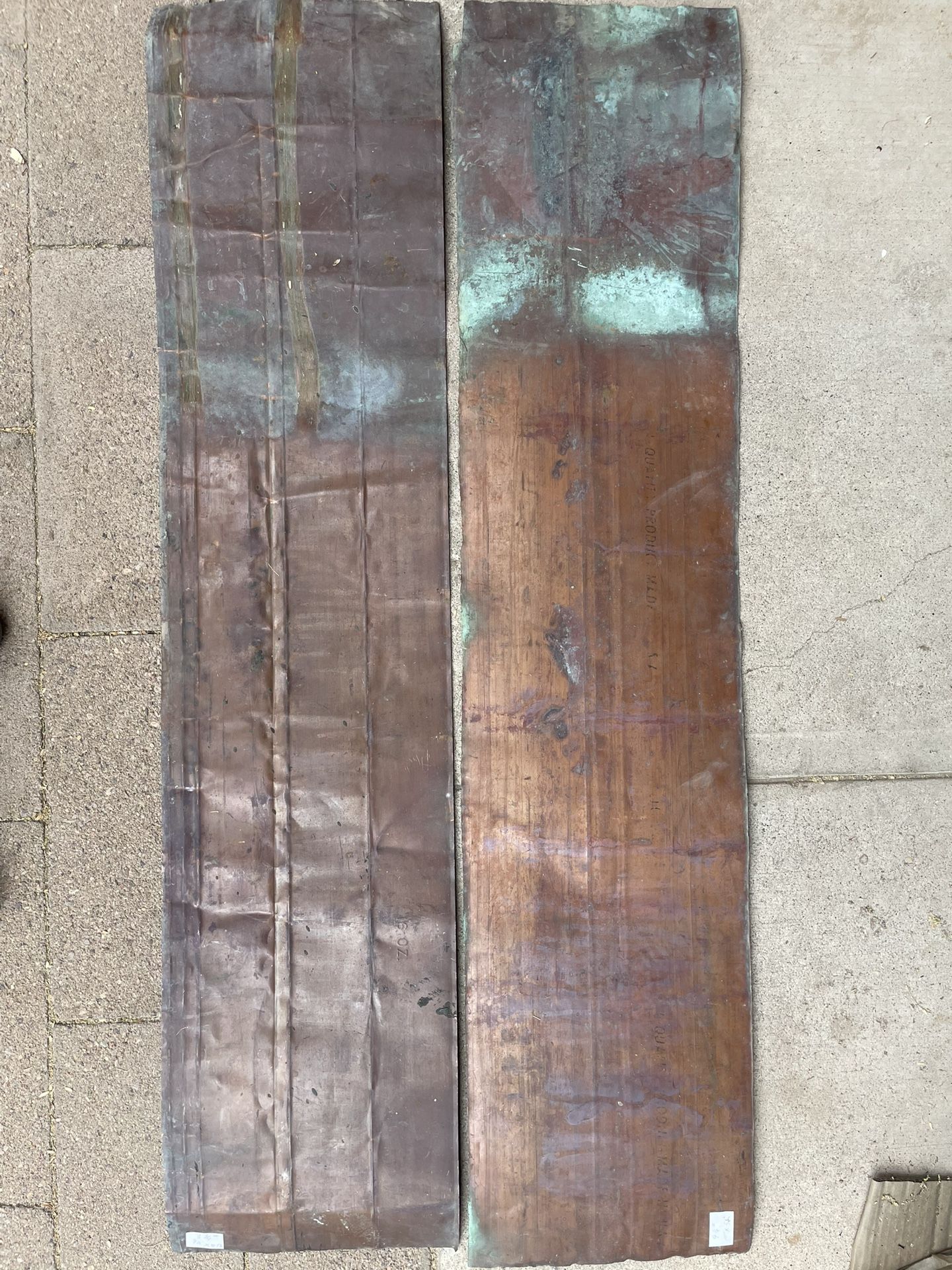 Copper Sheets (2) 12” x 5 ft long 16oz, stamped made in USA 16 OZ one weights 4 1/2 lbs other 3 3/4 lbs $80 for each sheet