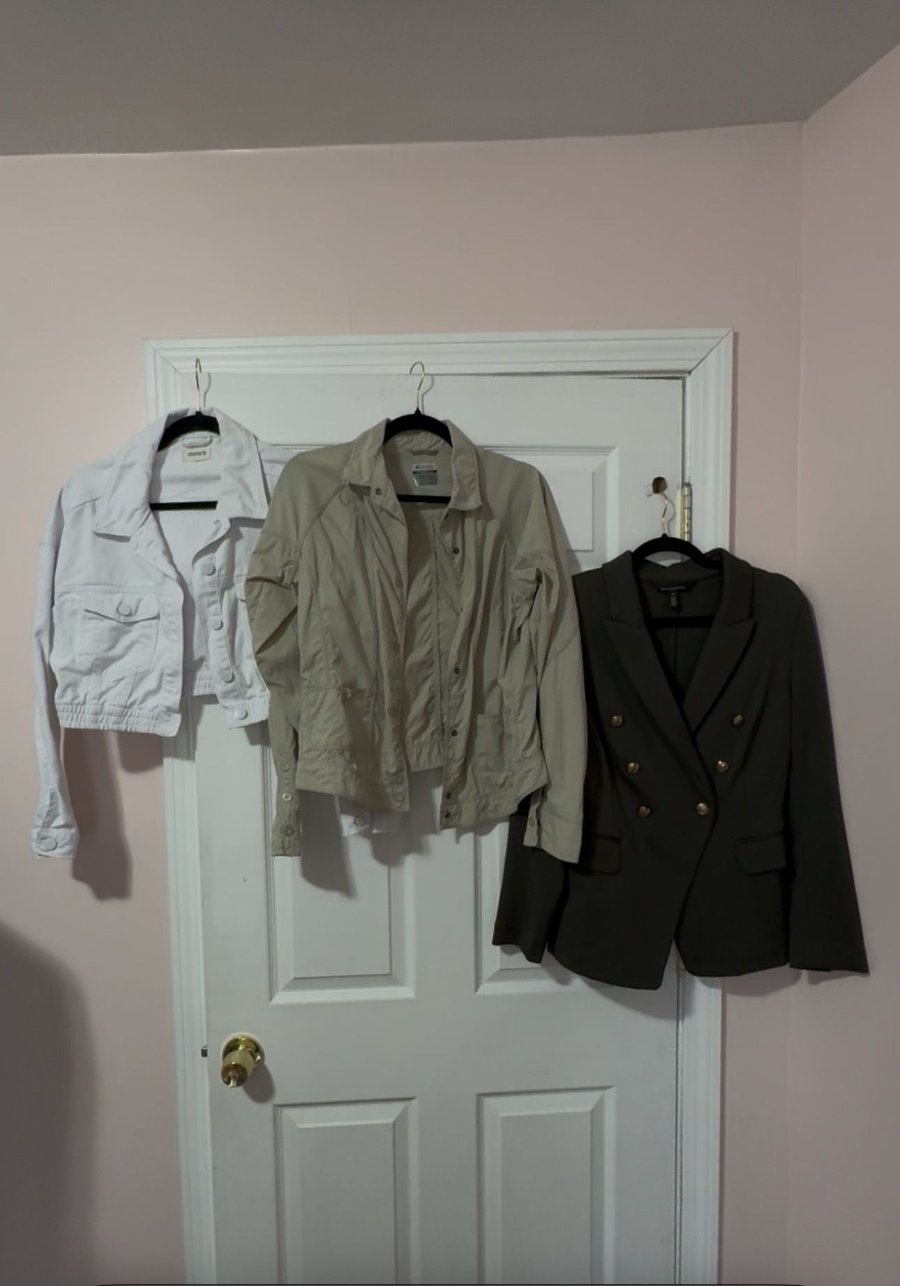 1st is a crop top denim jacket in white with white detailing. New without tags, never worn. $20 SOLD 2nd Columbia thin shell jacket in tan. SOLD 3rd White House Black Market size 10 suit jacket in hunter green with gold buttons. $25 Machine washable. Never been dried, no stretching, fading, shrinkage, snags or stains.
