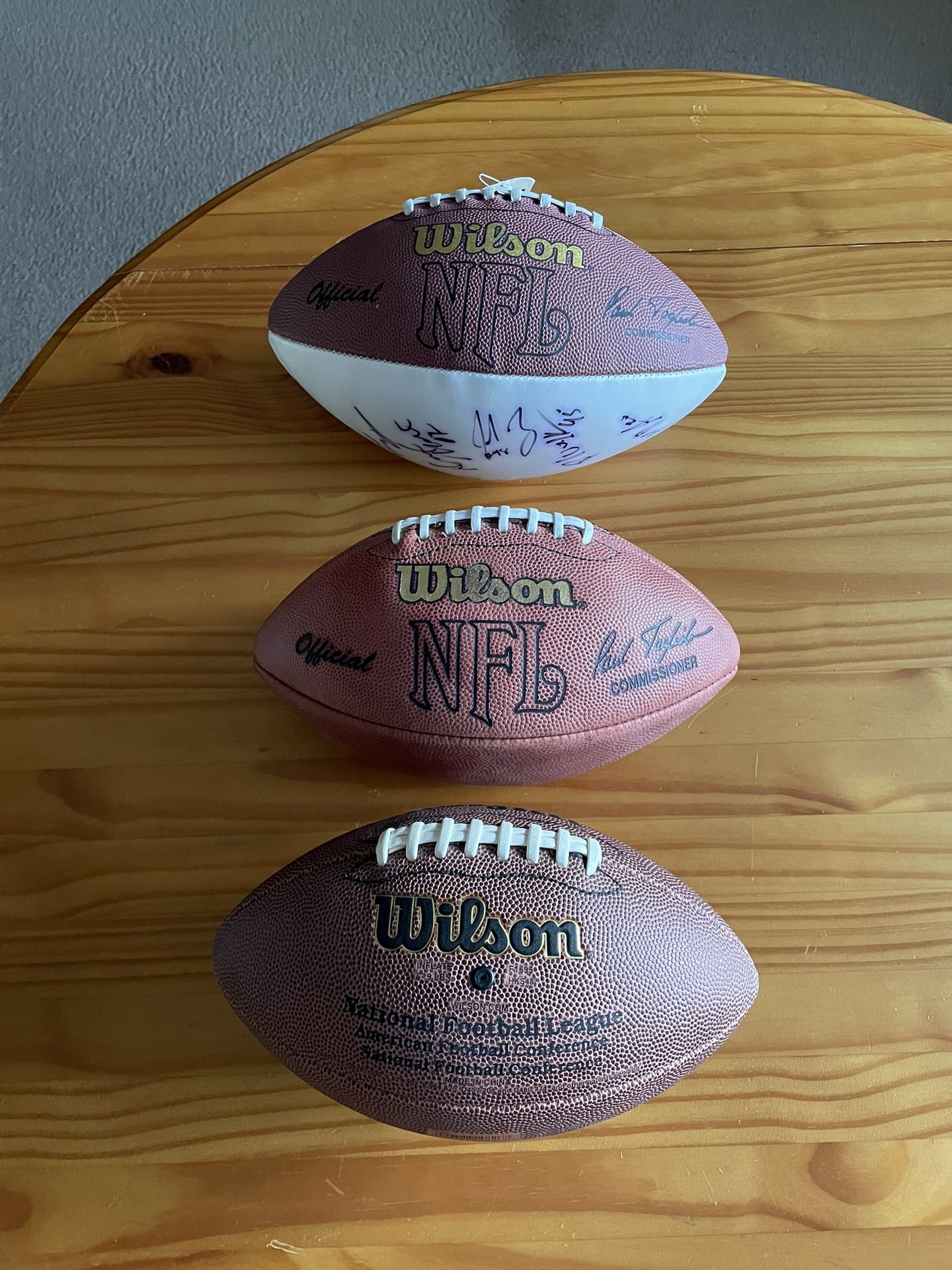 3 Official NFL Wilson Footballs - Paul Tagliabue Signature, Bronze Series & Autographed White Football W/ List Of Players