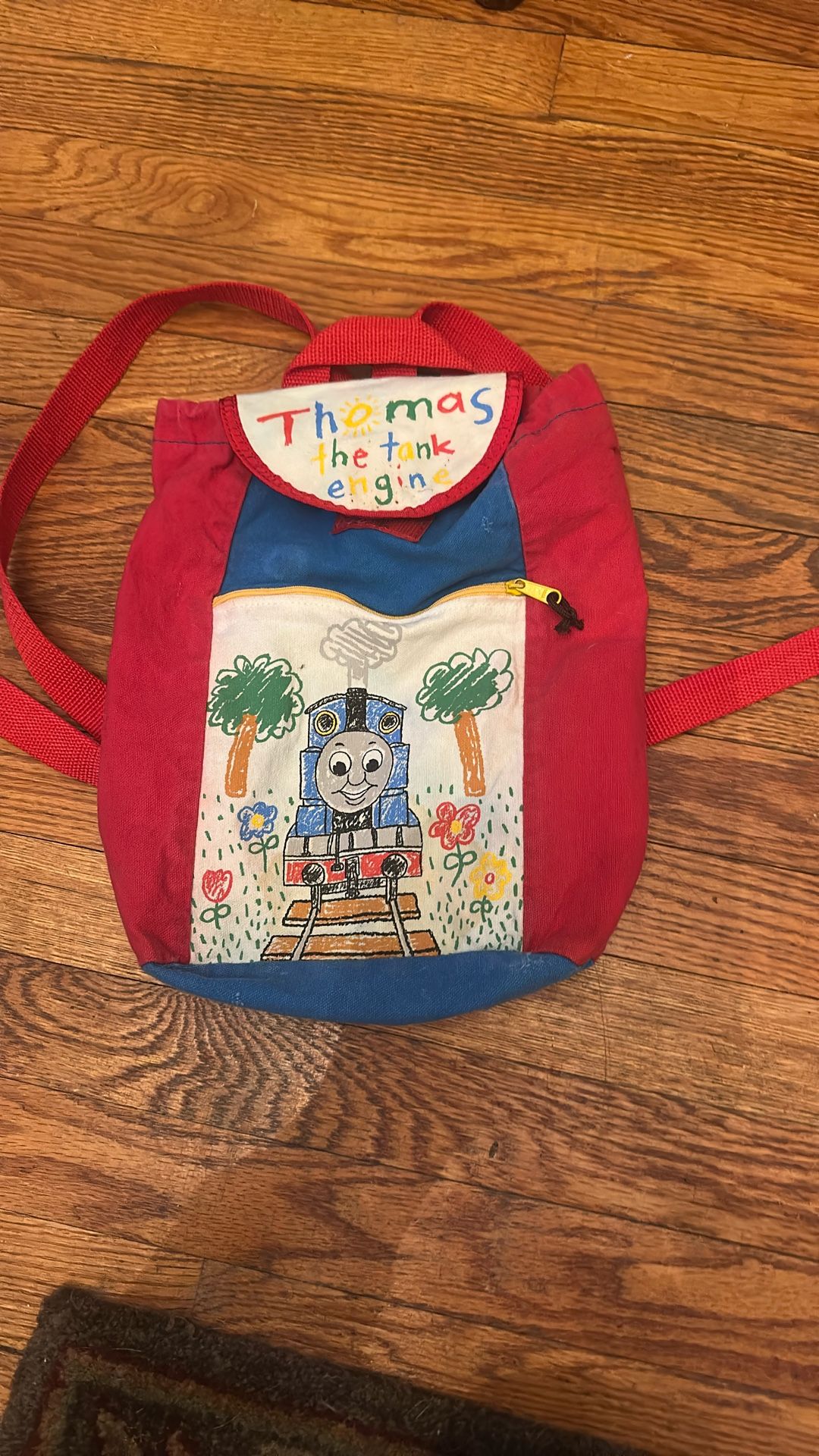 8”x12” cloth backpack with adjustable straps. This item was circa 1(contact info removed). Shows slight wear on the bottom, otherwise, it’s a great bag to carry Thomas n friends.
