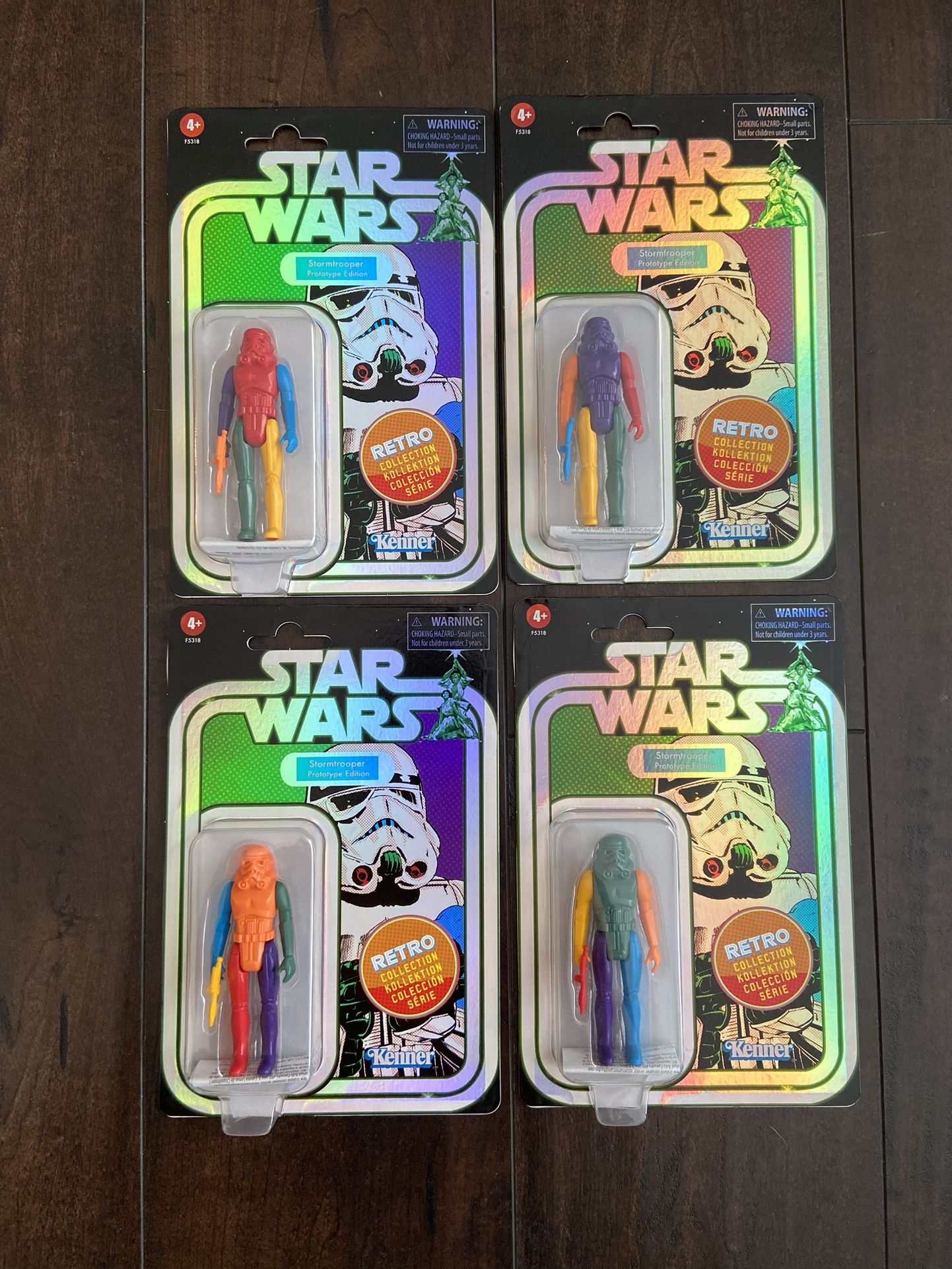 Star Wars Retro Collection Stormtrooper Prototype Edition This is the sold out Target exclusive featuring a retro styled Stormtrooper prototype edition. They come in various colors and they are all in great condition. (Green helmet stormtrooper is sold out). $25 each. Price is firm. Not interested in trades. Description: PROTOTYPE EDITION STORMTROOPER ACTION FIGURE: Inspired by the original 1970s Kenner Star Wars action figures, this Retro Collection 3.75-inch-scale Stormtrooper action figure features premium design and five points of articulation MULTI-COLORED PROTOTYPE STYLE DECO: This figure’s vibrant, multi-colored prototype deco is sure to add a bright pop of color to any fan’s Star Wars collection MOVIE-BASED CHARACTER-INSPIRED ACCESSORY: With his blaster accessory in hand, this poseable Retro Collection Stormtrooper figure is great for play and display with Star Wars collectors’ other classic toys (Sold separately. Subject to availability RETRO POP ART STYLE PACKAGING: Beautifully rendered retro packaging captures a colorful pop art style and includes throwback Star Wars branding and a Kenner Toys logos