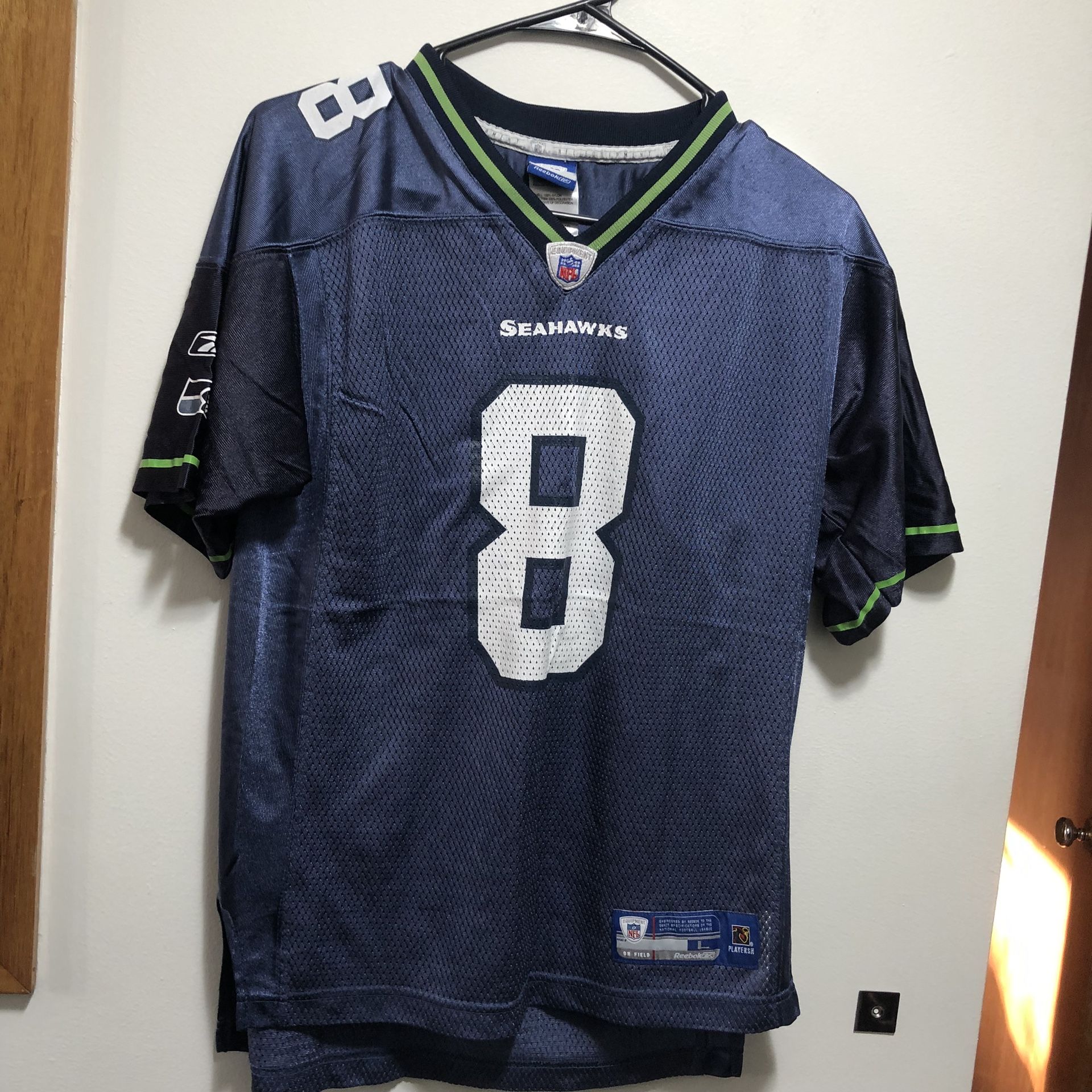 Seattle Seahawks Jersey Youth Boy's Blue White Reebok On Field #8 Hisselbeck Football Size Large(14-16)is good condition. Hall