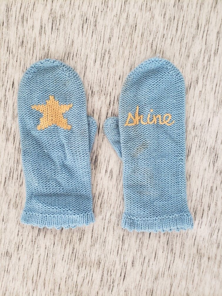 Light Blue Knit Mittens With Yellow Star & "Shine"