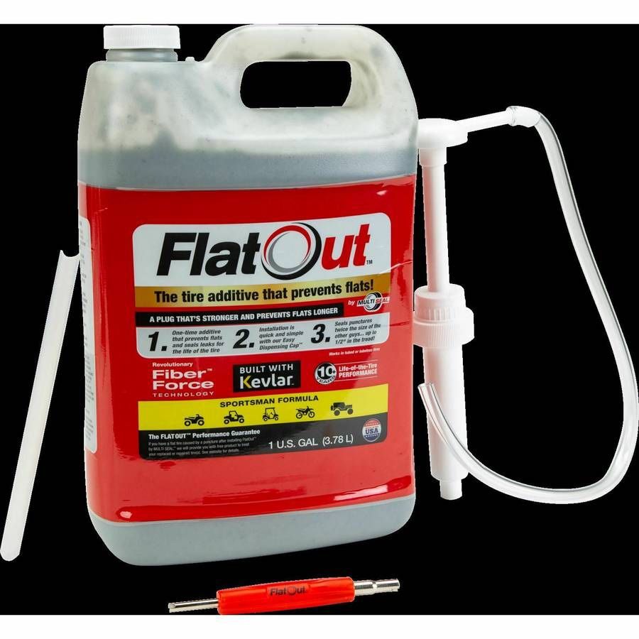 Flat Out Tire Sealant Additive 1 US Gallon - 128oz Brand new sealed package. Simply the best tire sealant available - beats Stans and Slime hands down! Normal retail price $60 + Tax PRODUCT DETAILS: *Kevlar added *10 year performance warranty *One time additive that prevents flats and seals tires for the life of the tire *Pump included *Quick and simple installation with the easy dispensing cap *Seals punctures twice the size of other sealants *Capable of sealing punctures up to 1/2 inch in size FIT GUIDE - ATV, Motorcycle, eBike, MTB, Ride on Mower, Wheelbarrow, Quad etc
