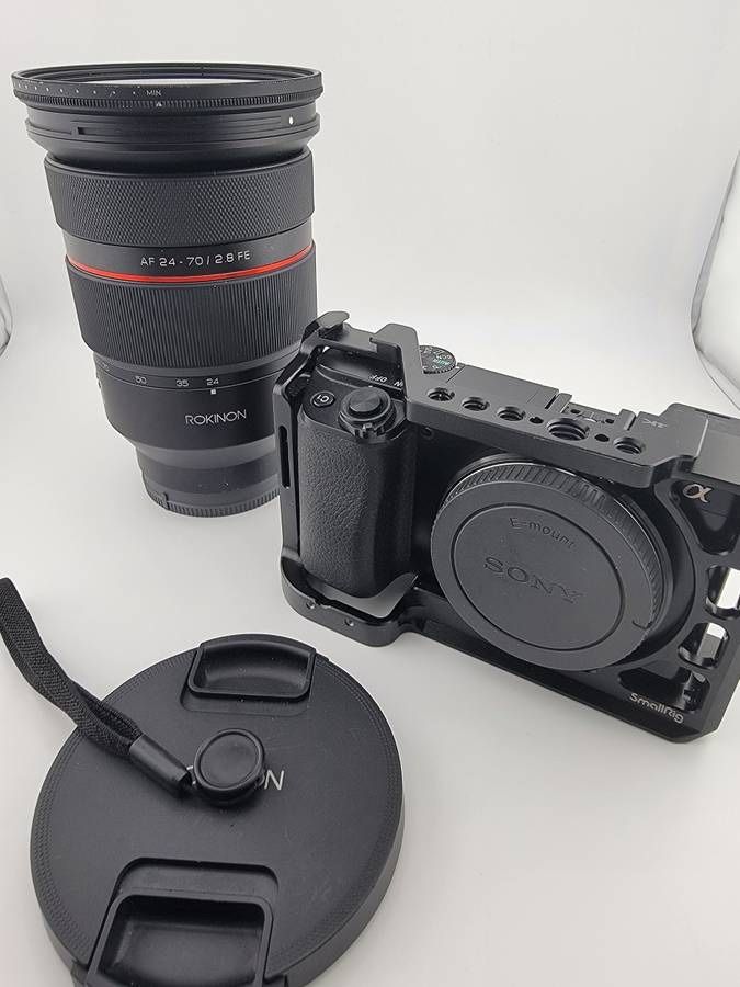 Sony Alpha a6100 24.2mp 4k Camera Rokinson 24-70mm F/2.8 Fe lens Adjustable tinted Indy Filter Small Rig Camera Cage This Sony a6100 mirrorless digital camera is in great condition. The camera comes with a rokinson 24-70mm lens that has an adjustable tinted indy filter. The camera is in a Small Rig brand camera cage allowing many mounting solutions. The Camera does not come with a charger and only includes one battery that can be charged via micro USB through the camera port. The Camera has 9350 shutter count. Any questions feel free to send a message. Signature required upon delivery! OM-10140