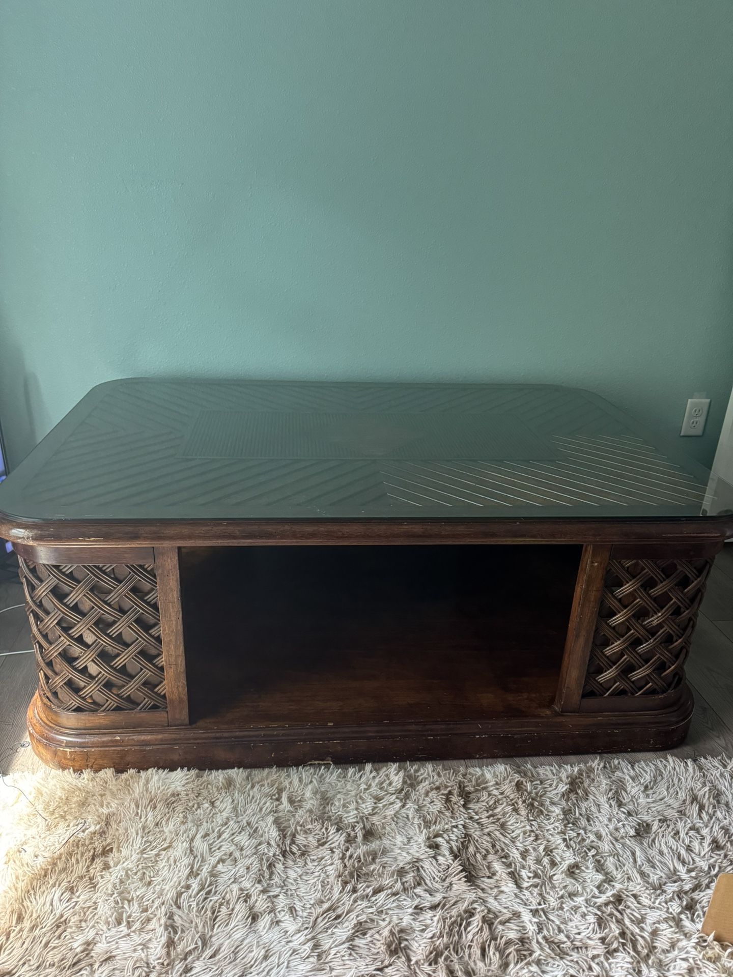 Sturdy and stylish coffee table with beautiful woven panel detailing and a spacious open storage shelf underneath—perfect for books, baskets, or decor. Made of solid wood with a rich finish and a glass top featuring a unique geometric design. There are a few scratches and scuffs along the bottom trim and underneath (see photos), but overall it’s in good condition with lots of life left. Heavy and well-made. Dimensions: • Length: 50 in • Width: 36 in • Height: 20 in