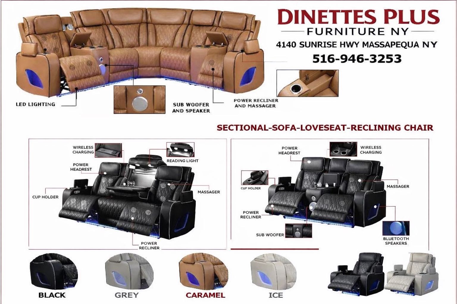 Upgrade your living room with ultimate comfort & technology: ✔️ Power Recliners & Headrests ✔️ Built-In Bluetooth Speakers & Subwoofer ✔️ LED Ambient Lighting ✔️ USB & Wireless Charging ✔️ Massage Function ✔️ Cup Holders & Hidden Storage Available as Sectional • Sofa • Loveseat • Reclining Chair Multiple colors available! 📍 Dinettes Plus Furniture NY 4140 Sunrise Hwy, Massapequa NY 📞 (contact info removed) 💳 No Credit Needed Financing Available 🚚 Fast Delivery • Local Family Business 👉 DM us or call now!