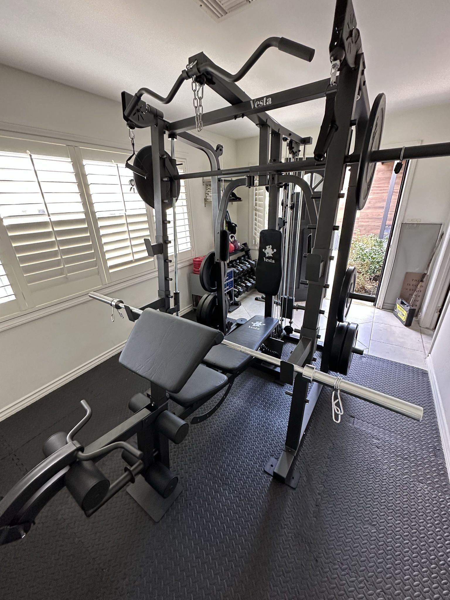 New In Box! FREE DELIVERY AT FULL PRICE!Click Profile For More Gym Listings! Only Account! Cash / Venmo / Credit Cards / Finance Available! WARRANTY INCLUDED The Vesta Multi-function Smith Machine SM2001 is equipped with different strength machines and exercise station to bring the full gym experience to your home gym. It is designed to have a variety of exercises within one compact design The Ultimate ALL-IN-ONE Machine: Smith Machine Squat Rack Functional Trainer Lat Pulldown Weight Bar Preacher Curl/Leg Lever Bench Press Butterfly Arm Dimension for SM2001 Machine: 84“H x 74“L x 83"W Dimension for FID Bench: 36"H x 73"L x 19"H Upgrades or Add Ons •Free Switch to 245lbs Cast Iron plates 45s/35s/25s/10s/5s/2.5s •$40 3ft by 3ft Rubber Mats •$90 4ft 20lbs Curl OLYMPIC WEIGHTS GYM EQUIPMENT OLYMPIC STANDARD WEIGHT SLED PUSH SLED WEIGHTS WEIGHT PESAS SQUAT RACK POWER CAGE SMITH MACHINE BENCH PRESS INCLINE DECLINE BARBELL BAR HEX BAR BUMPER PLATES ADJUSTABLE BENCH FLAT BENCH BENCH DUMBBELLS DUMBELL ADJUSTABLE DUMBBELLS KETTLE BELLS DIP STATION PULL UPS PULL DOWN BATTLE ROPE BOWFLEX POWERTEC POWERBLOCKS HOIST BODY SOLID ROGUE FITNESS EXERCISE