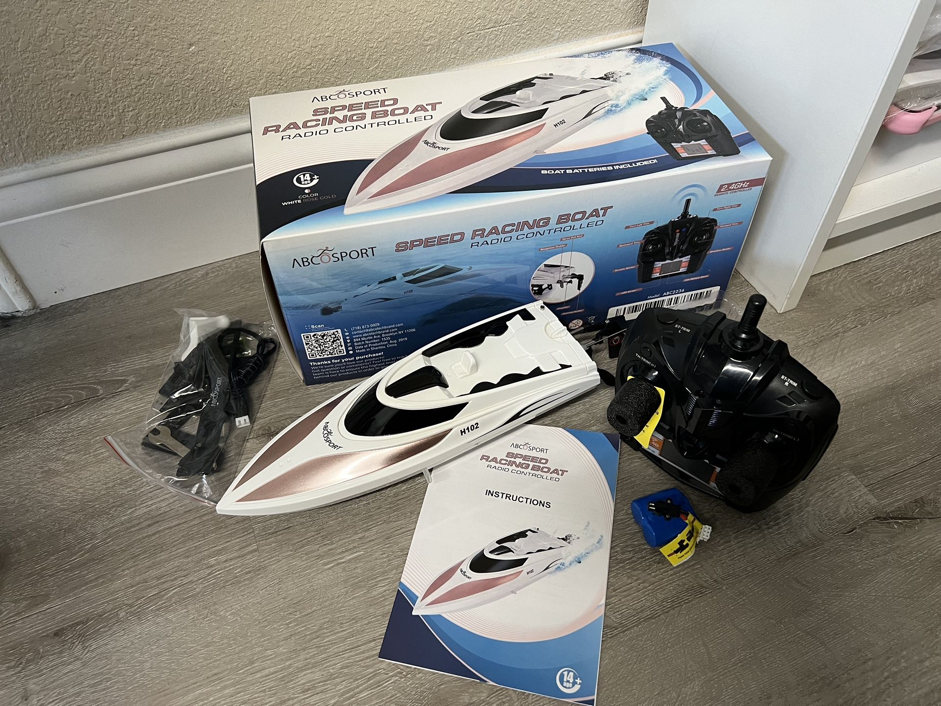 Remote Control Boat, 20MPH speed, 4 Channels Racing, 2.4GHz Remote Remote Control Boat – 20 MPH Speed – 4 Channel Racing – 2.4 GHz Remote CONQUER THE WATERS – Zip the seas with the REVOLUTIONARY ABCO remote-control boat and convert dull playtimes into a thrilling time – discover ELECTRIFYING FUN at fast 20+ MPH speeds & interference-free 4 channel racing with the remote-controlled boat for kids! INNOVATIVE DESIGN – DOUBLE HATCH BODY that helps improve wave resistance, CAPSIZE RECOVERY MODE lets you set the boat upright when its flips, AUTO-CORRECTING RUDDER prevents off-course veering & WATER-COOLED ENGINE keeps the RC boat running smoothly! Smart Remote – RC speed boat features a 2. 4 GHz remote control with an LCD display that shows the signal/power/trim adjustment/Left-Right throttle switch mode, emergency stop function & low signal warning that indicates when the remote boat is out of range. Classy & durable – remote-control Boats for kids comes in a beautiful rose gold body, a powerful rechargeable 7. 4 V 600 mAh Li-Po battery. These electric toys have a strong waterproof body that will last for many rides to come! Perfect gift – remote-control boat for pool Makes just the best gift for all sailing, motor, jet & speedboat aficionados for birthdays, anniversaries, farewell, best wishes, Thanksgiving, Christmas, Hanukkah, new Year’s and much more! Perfect toy boat for 6, 7, 8. 9, 10-year-old boys' and girls and above – RC Boats are even for adults! Ideal for lakes or pools – not meant for salty waters. RACE LIKE A PRO Cut the waves and race up to thrilling 20+ MPH speeds with our remote-control boat. 4 channel interference-free function allows you to race with multiple boats at the same time. Water-cooled engine keeps the motor running smoothly and efficiently. Auto-correcting rudder keeps your boat from traveling off course. Ideal for children ages 14 & up. INNOVATIVE REMOTE-CONTROL 2.4 GHz remote control with LCD screen displays signal, power, trim adjustment & left-right throttle switch mode. Low-signal alarm informs you when the RC boat is away from range. Capsize recovery mode turns the boat back to its racing mode in the event of a flip. Emergency stop function lets you stop the remote-control boat any time. PACKAGE CONTAINS 1 x RC Boat 1 x 2.4 GHz Remote Control 1 x 7.4 V 600 mAh Li-Ion battery USB Charging Cable 1 x Spare Propeller Boat Lubrication Boat Tool Instructions — Comment for Mercari CONQUER THE WATERS – Zip the seas with the REVOLUTIONARY ABCO remote-control boat and convert dull playtimes into a thrilling time – discover ELECTRIFYING FUN at fast 20+ MPH speeds & interference-free 4 channel racing with the remote-controlled boat for kids! INNOVATIVE DESIGN – DOUBLE HATCH BODY that helps improve wave resistance, CAPSIZE RECOVERY MODE lets you set the boat upright when its flips, AUTO-CORRECTING RUDDER prevents off-course veering & WATER-COOLED ENGINE keeps the RC boat running smoothly! Smart Remote – RC speed boat features a 2. 4 GHz remote control with an LCD display that shows the signal/power/trim adjustment/Left-Right throttle switch mode, emergency stop function & low signal warning that indicates when the remote boat is out of range. 1x RC Boat 1x 2.4 GHz Remote Control 1x 7.4 600 mAh Li-ion battery 1x USB charging Cable 1x Spare Propeller 1x Boat Lubrication 1x Boat Tool 1x Instruction