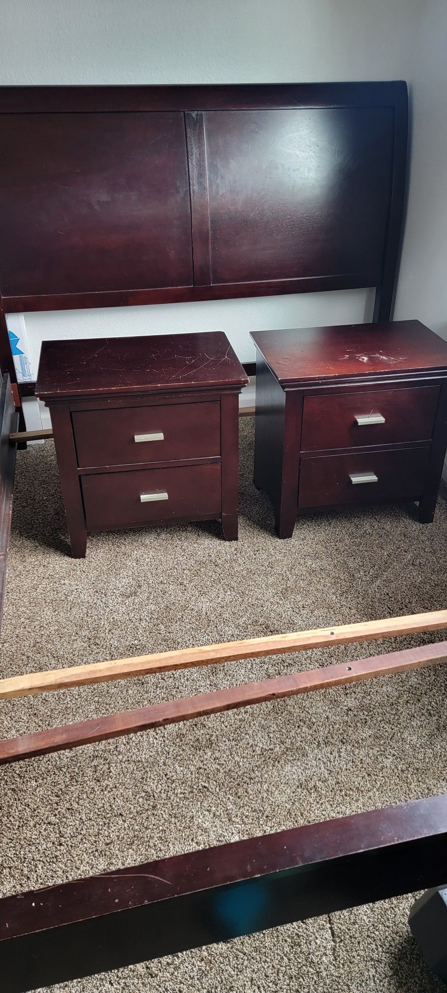 Queen bed set 1 brown wood base 2 side tables 1 dresser 6 drawers with mirror