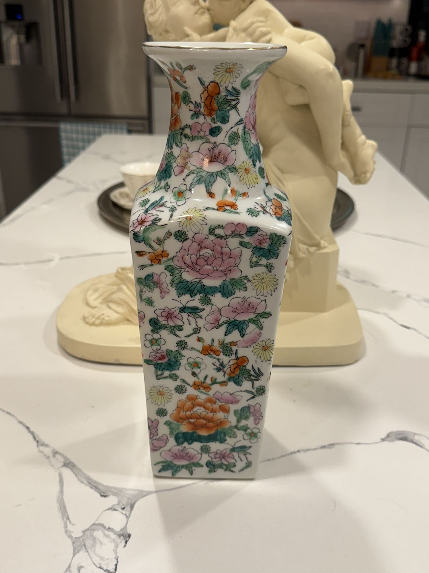 Beautiful vintage Chinese porcelain vase with a classic square baluster shape. Hand-painted floral design featuring peonies and chrysanthemums in soft pink, orange, green, and yellow tones on a white background. This vase measures approximately 12.5 inches tall and has elegant proportions, making it perfect as a decorative accent for a living room, entryway, dining area, or antique collection