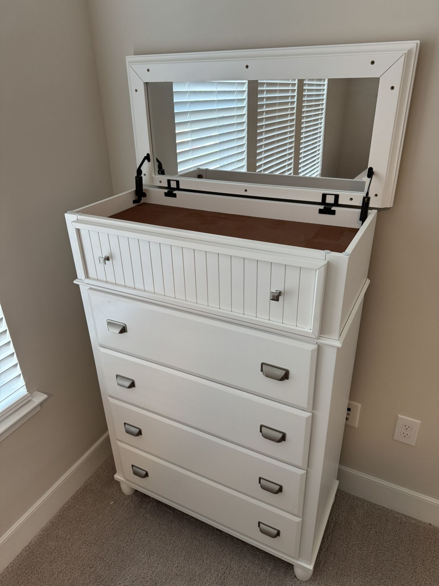 White Dresser. Brand New. Ready for pick up right away. Height 52 inches, length 36 inches, width 14.5 inches. Comes with an internal build-in foldable mirror and is damped with soft material.