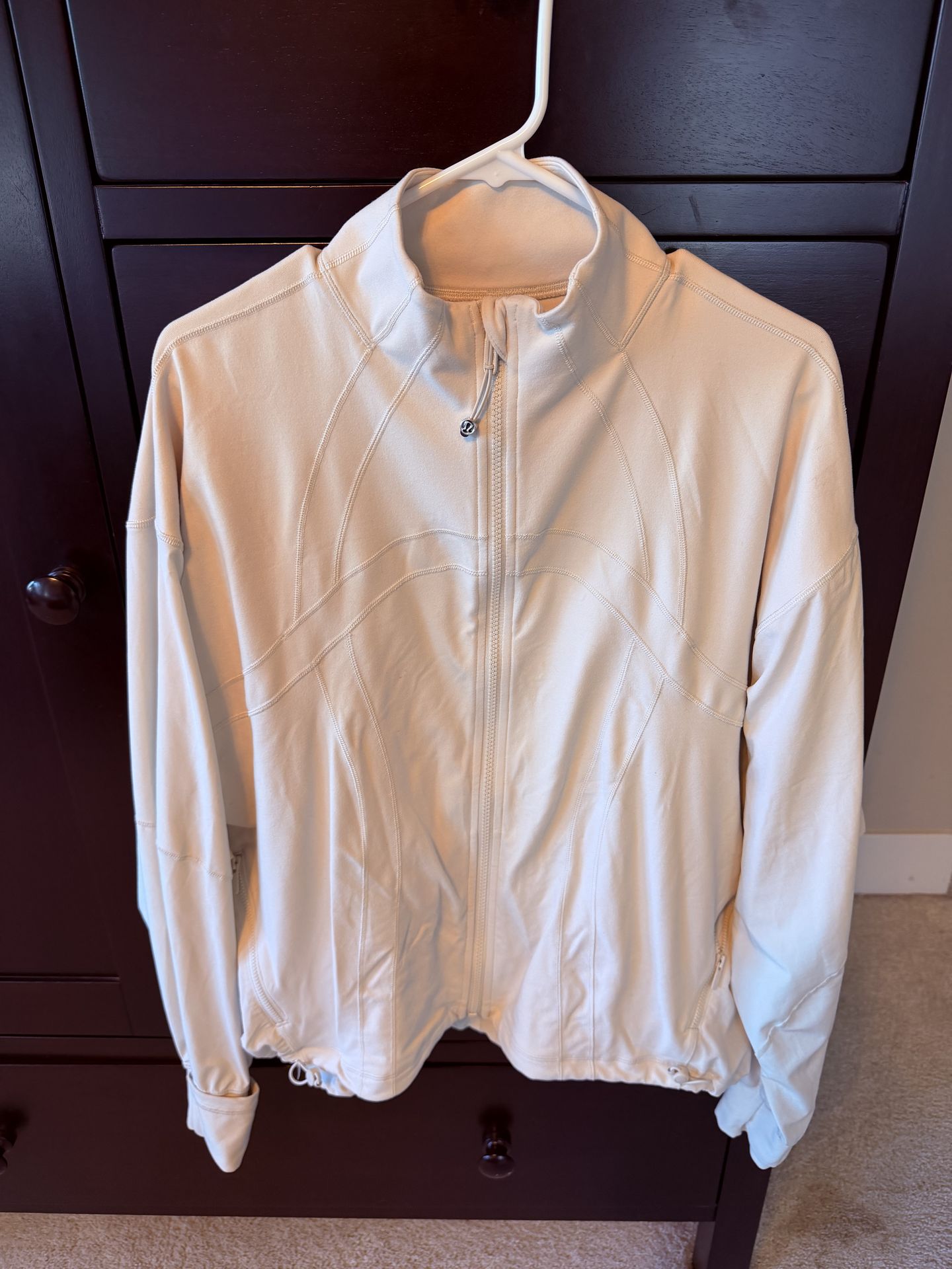 Original Price: $148 Color: Bone Cottony-soft feel, luon™ fabric Sweat-wicking Four-way stretch Supportive Breathable Added Lycra® fibre for stretch and shape retention Swift fabric on back and sleeves is lightweight, sweat-wicking, and quick-drying relaxed fit, hip length A loose fit with a little extra room Sits below the waistband for moderate, everyday coverage Thumbholes and Cuffins™ keep sleeves down and chills out Secure front pockets with a hidden phone sleeve Cinch the shock cords at the hem to adjust the shape Elastic zipper pull doubles as an emergency hair tie Locker loop for easy hanging Zipper garage keeps chafe in check Cash or Venmo only. Pick up near Woodinville High School.
