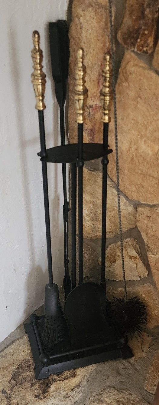 Complete your hearth with this classic 5-piece fireplace tool set, designed to combine functionality with timeless style. The set includes a sturdy stand, a poker, tongs, a shovel, and a brush—each crafted in durable black metal for lasting performance. The handles are adorned with elegant brass accents, adding a touch of sophistication that complements both traditional and contemporary décor. The tools hang securely on the matching stand, making them easy to access while maintaining a tidy appearance by your hearth. Whether you’re stoking the fire, cleaning ashes, or simply showcasing this set as a decorative accent, it brings both practicality and charm to your living space.