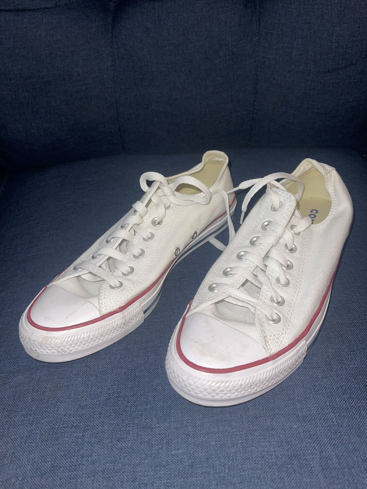 These are white converse in almost brand new condition! They were used once by a Forever 21 model during a campaign shoot. I don’t have the box but see how minimally used these are in size MEN 7/ WOMEN 9. I have a black pair listed (same size). I’ll let both pairs go for a total of $45.