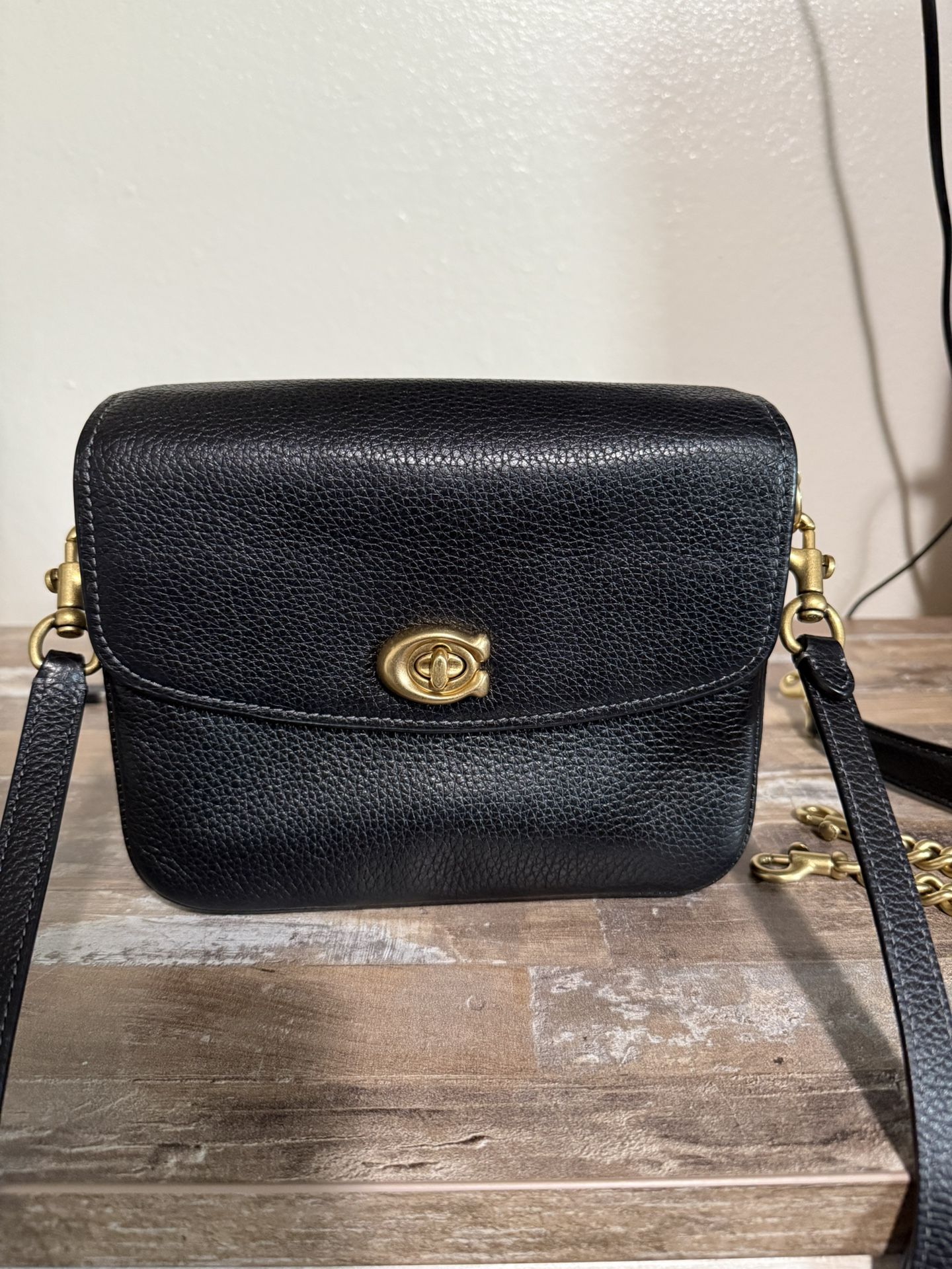 Coach crossbody bag in black with texture. Comes with gold chain strap and 2 regular leather straps, one is over the shoulder and the other is a shoulder strap. In really good condition and decent size. I also have the dust bag it came in. I bought it for $295 + tax on coach website. Asking $220 obo.